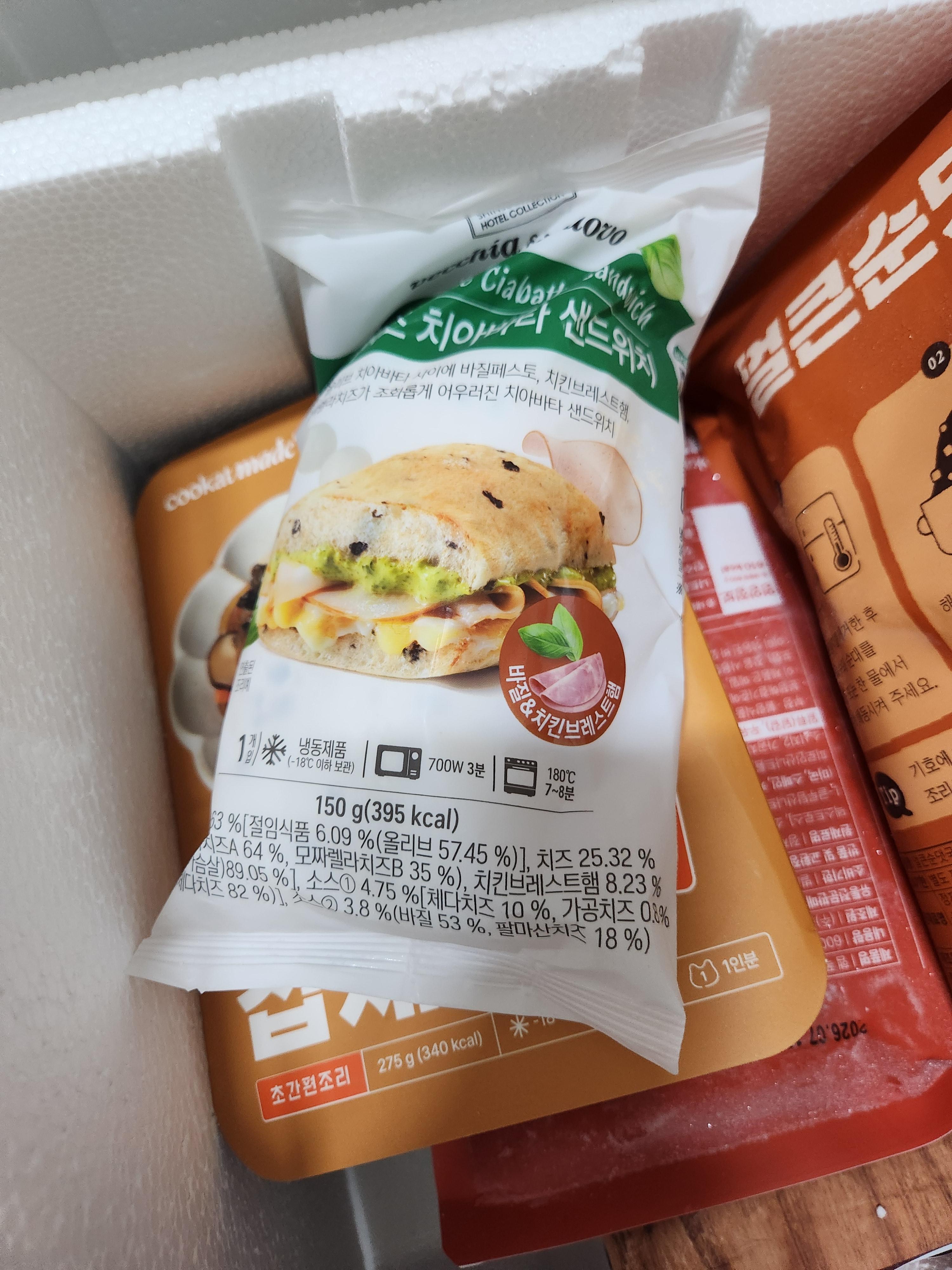 냉동 상태의 샌드위치의 포장지 끝부분을 살짝 찢어 전자레인지에 3분간 조리해 주세요. 덜 데워진 경우 30초 단위로 더 조리해 주세요.