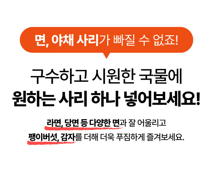 구수하고 시원한 국물에 면 사리가 빠질 수 없죠. 라면, 당면 등 다양한 면과 잘 어울리고 팽이버섯, 감자를 더해 더욱 푸짐하게 즐겨보세요.