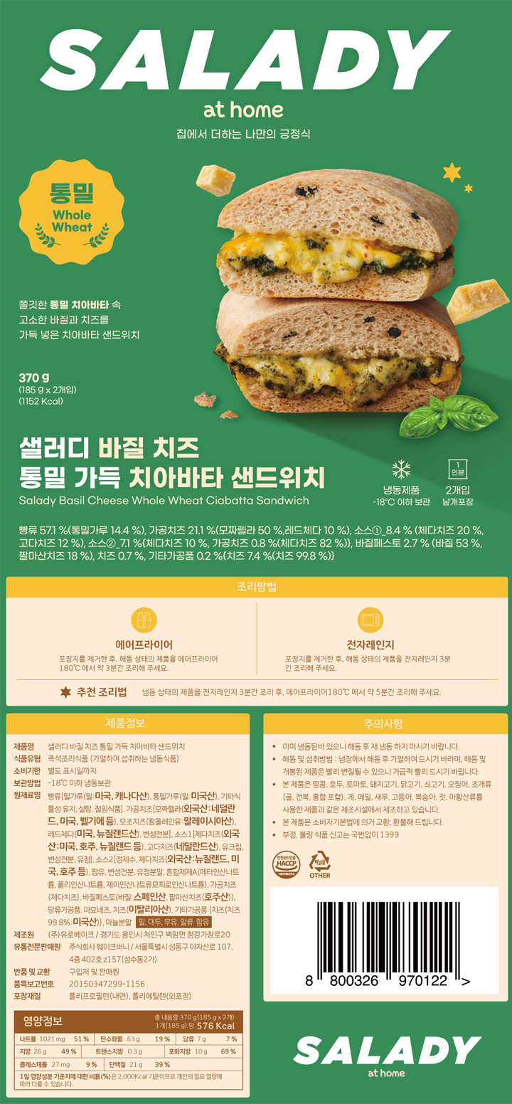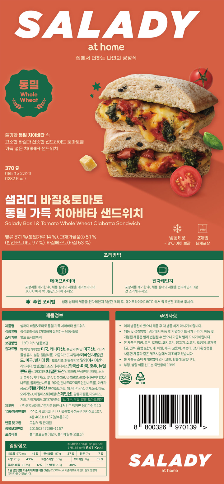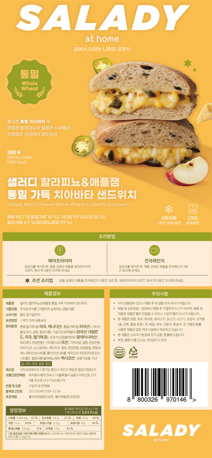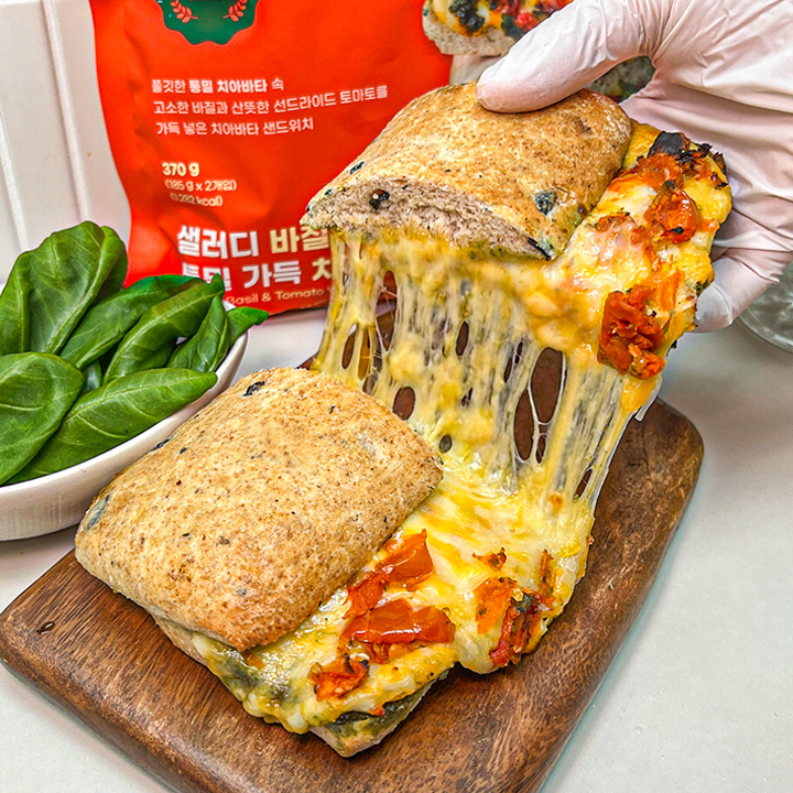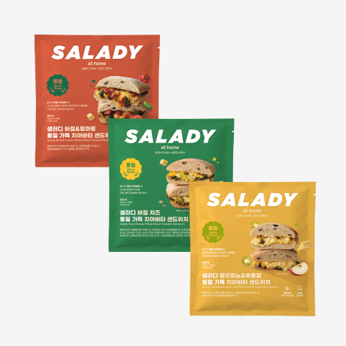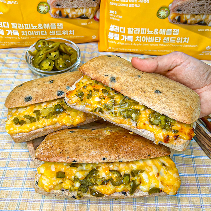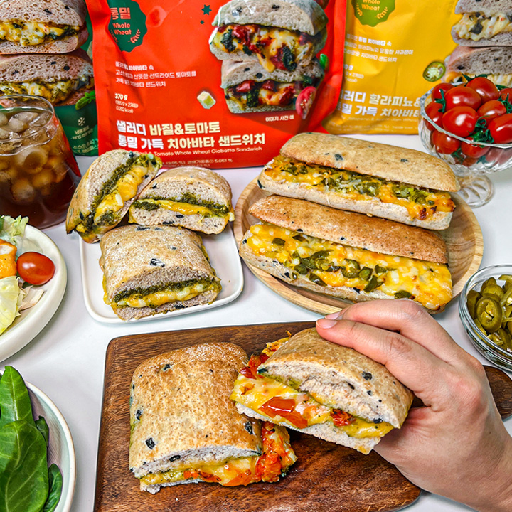 샐러디가 만든 간편식 브랜드 '샐러디앳홈'에서 통밀과 단백질을 꽉 채운 치아바타 샌드위치예요. 통밀 13.9%로 담백함을 살리고, 최대 21g의 단백질로 한 끼 식사로도 충분한 든든함을 더했어요. 여기에 치즈를 아낌없이 넣어 누구나 좋아할 진한 풍미까지 완성! 바질&치즈, 바질&토마토, 할라피뇨&애플잼까지 취향대로 즐길 수 있는 다양한 조합으로 맛의 재미를 더했어요. 전자레인지로 간편하게 완성되는 한 끼, 지금 50% 할인으로 만나보세요.