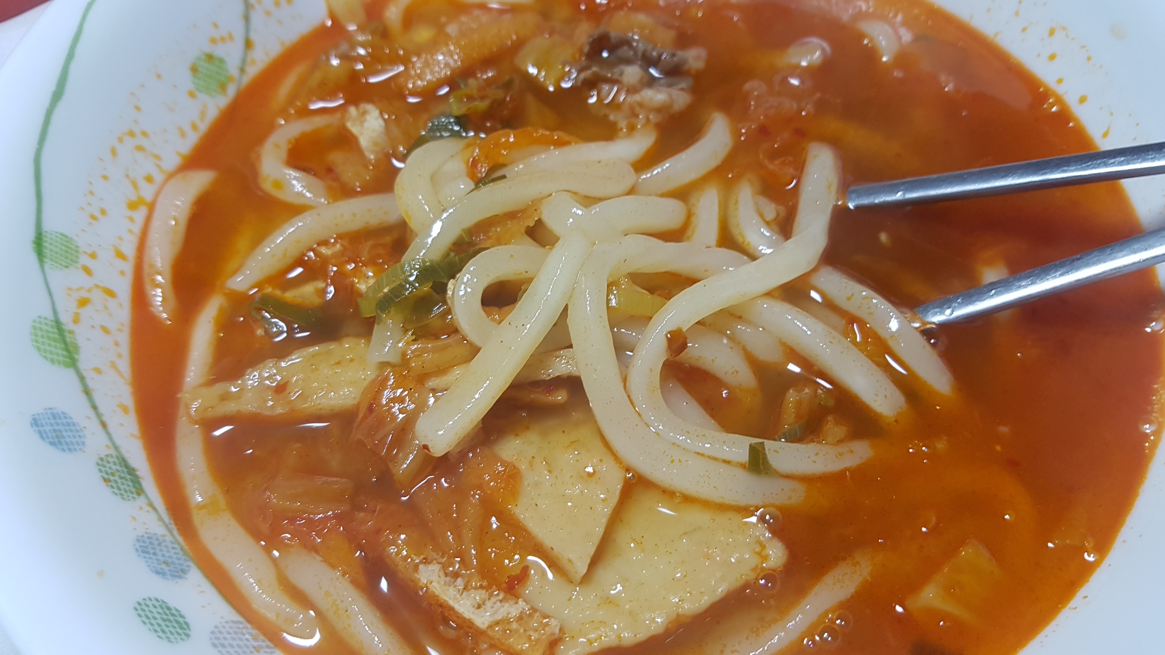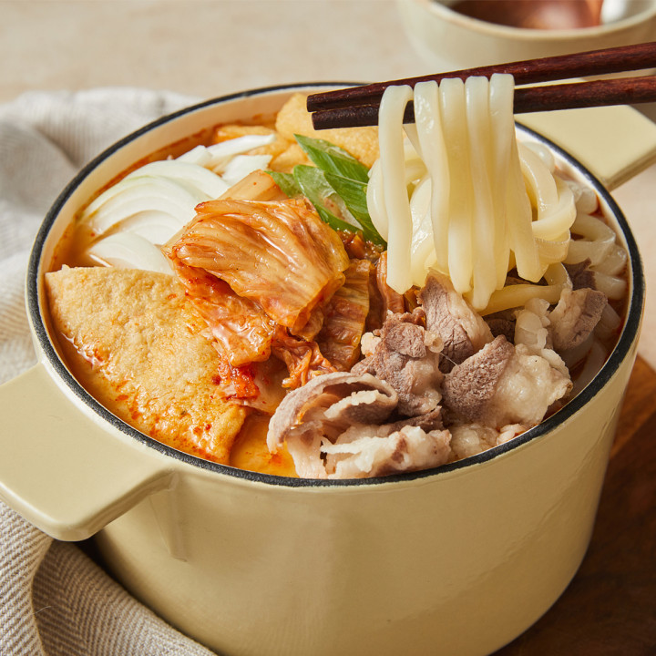 ③ 김치전골우동 : 깊고 진한 남해 멸치 육수에 김치, 우삼겹, 어묵, 유부, 대파를 넣은 우동
