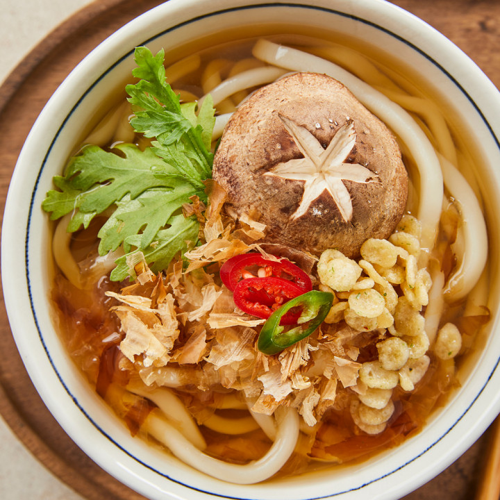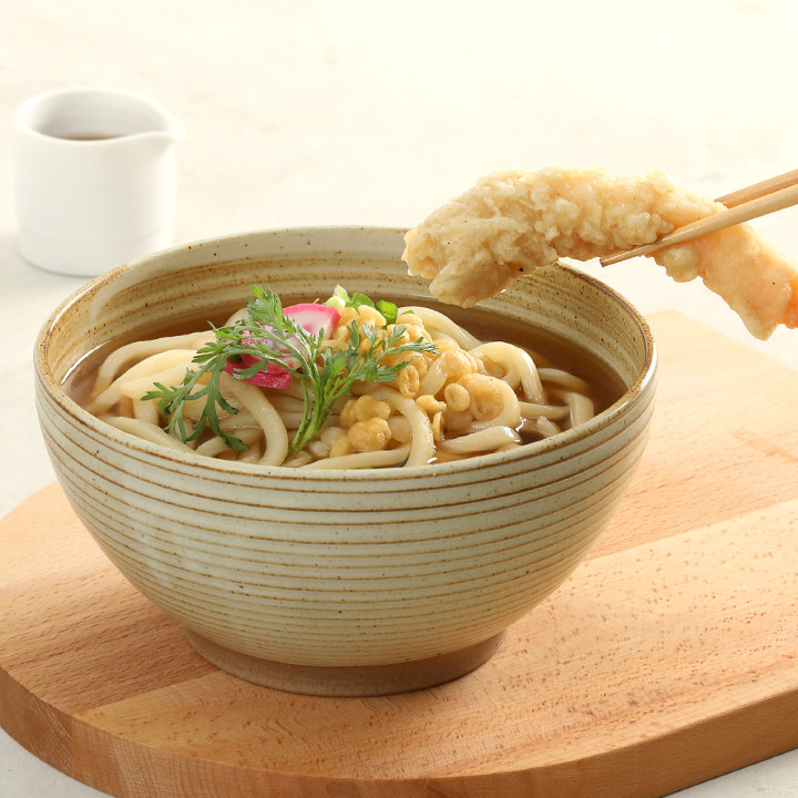 ① 새우튀김우동 : 가쓰오부시를 우린 국물에 속이 꽉 찬 새우튀김과 튀김볼 고명이 올라간 우동
