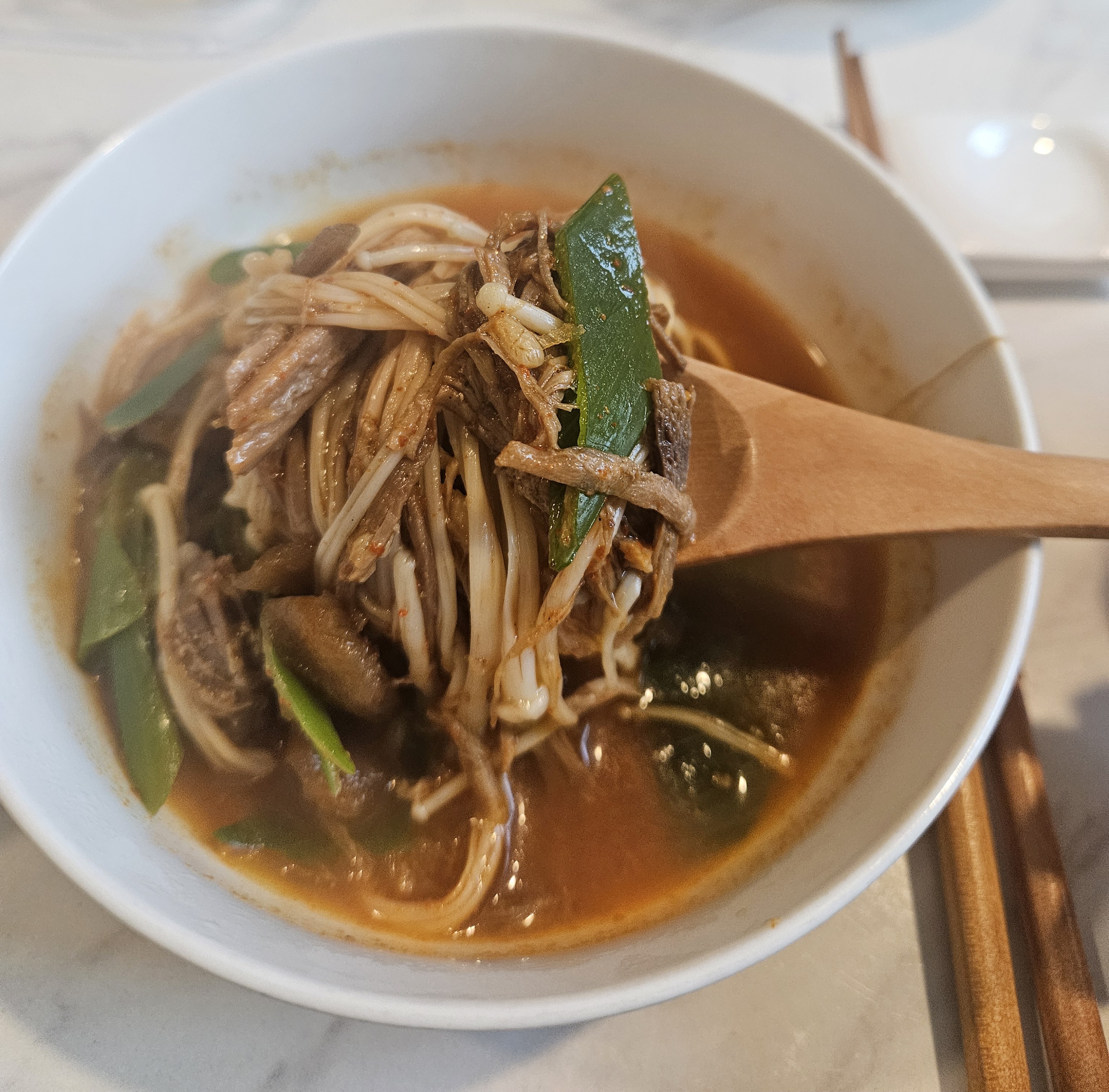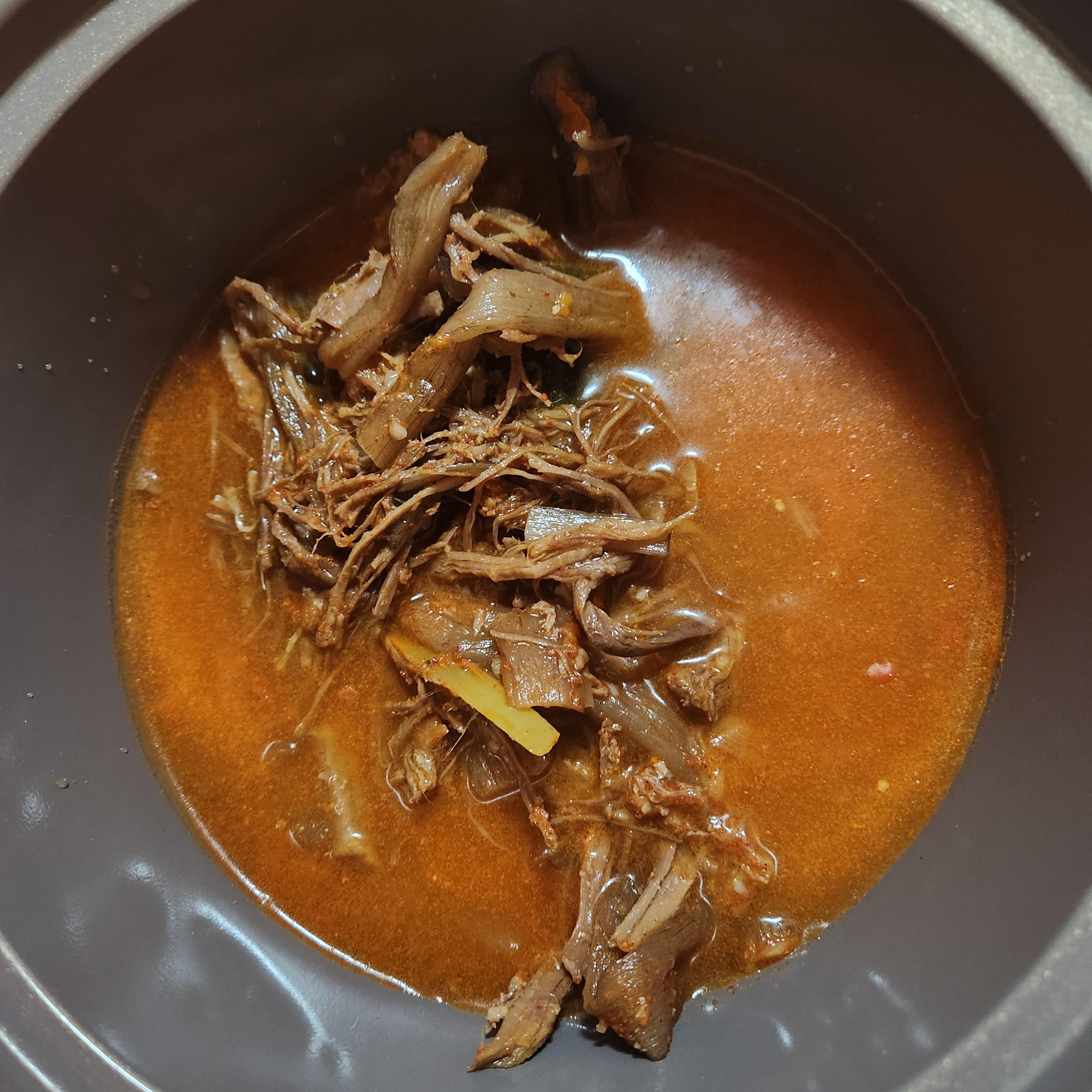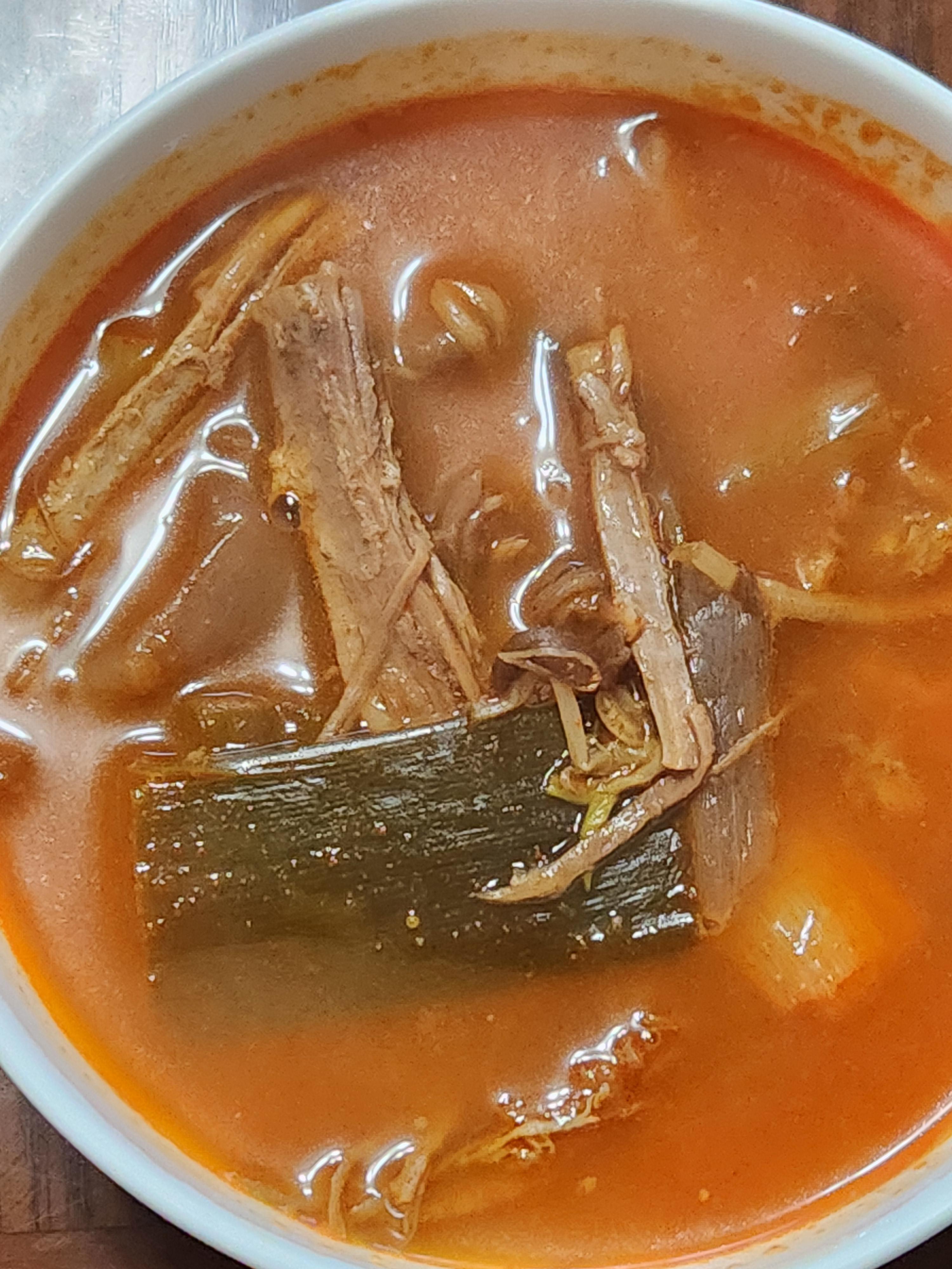 따끈하게 아점 먹고 싶어서 대파랑 팽이 버섯 넣고 데웠어요 그냥 먹어도 맛있고 깊은 맛이나요 고기도 부드럽고 밥에 훌훌 말아서 먹으니까 속 따뜻하구 좋네요 전 2끼로 나눠먹었어요~