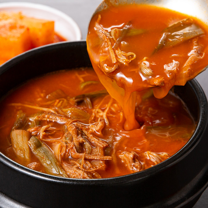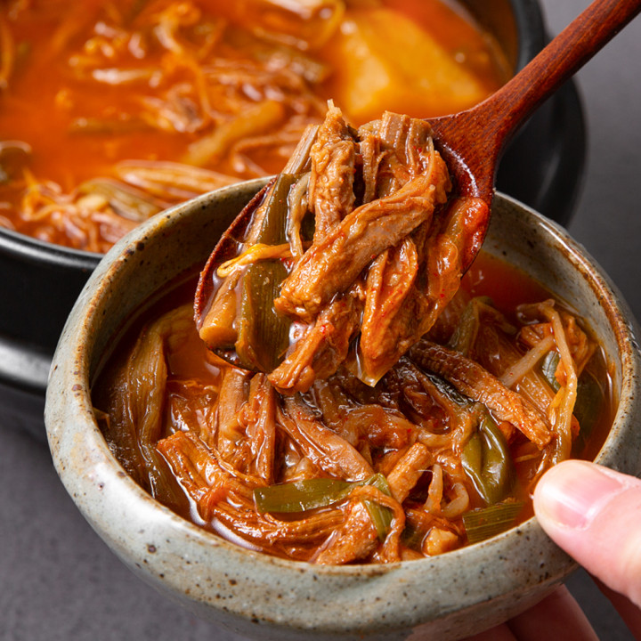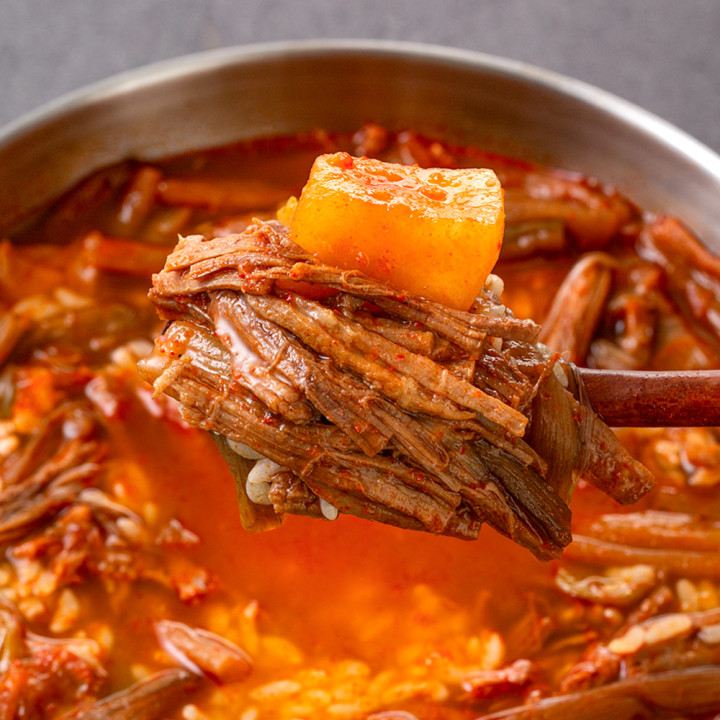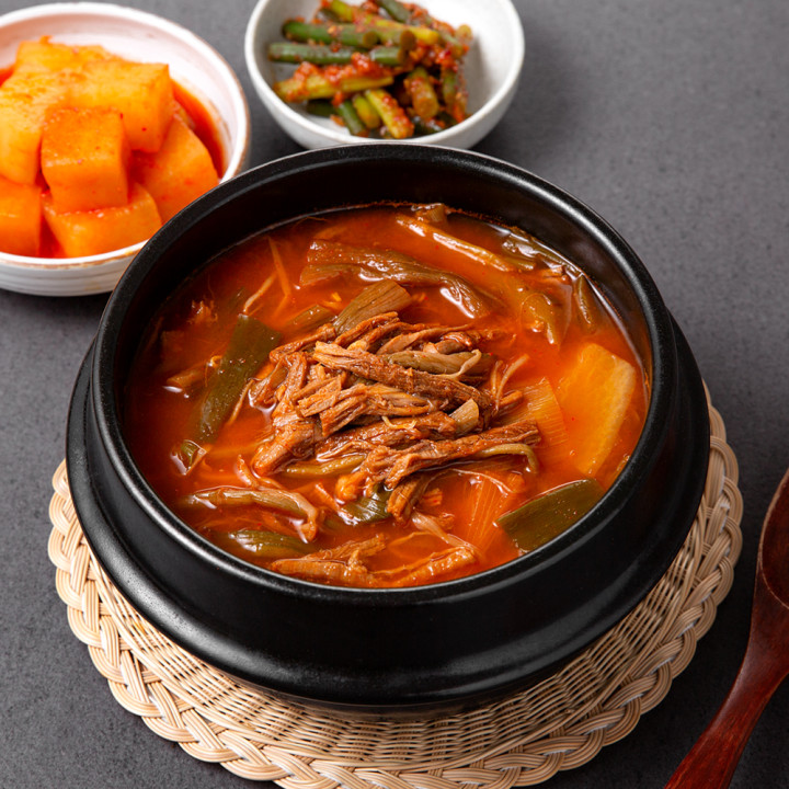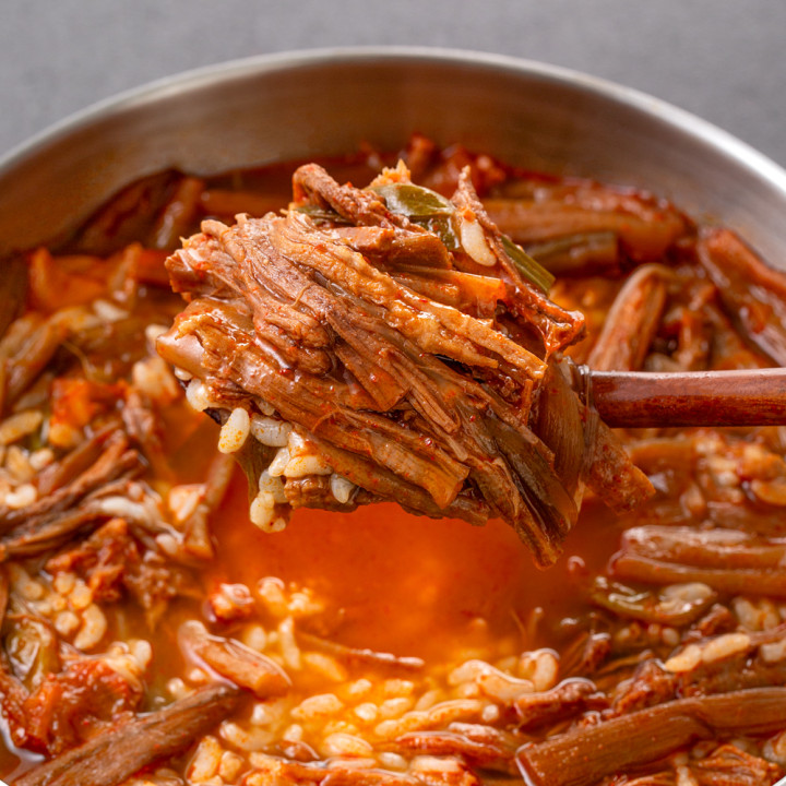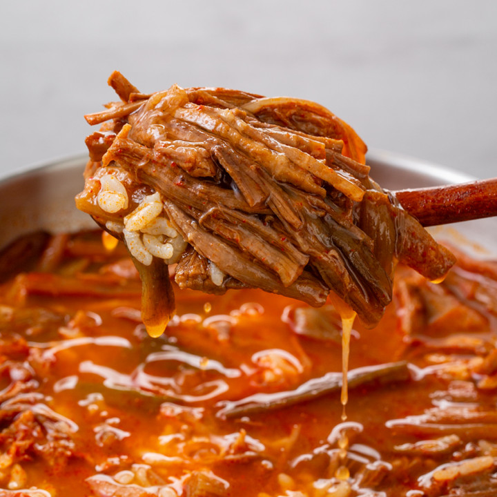 푸짐한 소고기의 양과 감칠맛으로 승부하는 고기폭탄 육개장! 토란대, 무, 대파 등 각종 야채까지도 아낌없이 넣었어요. 깊은 사골엑기스로 완성한 얼큰칼칼 국물에 밥 한 공기 말거나, 다양한 면 사리를 넣어 다채롭게 즐겨보세요.