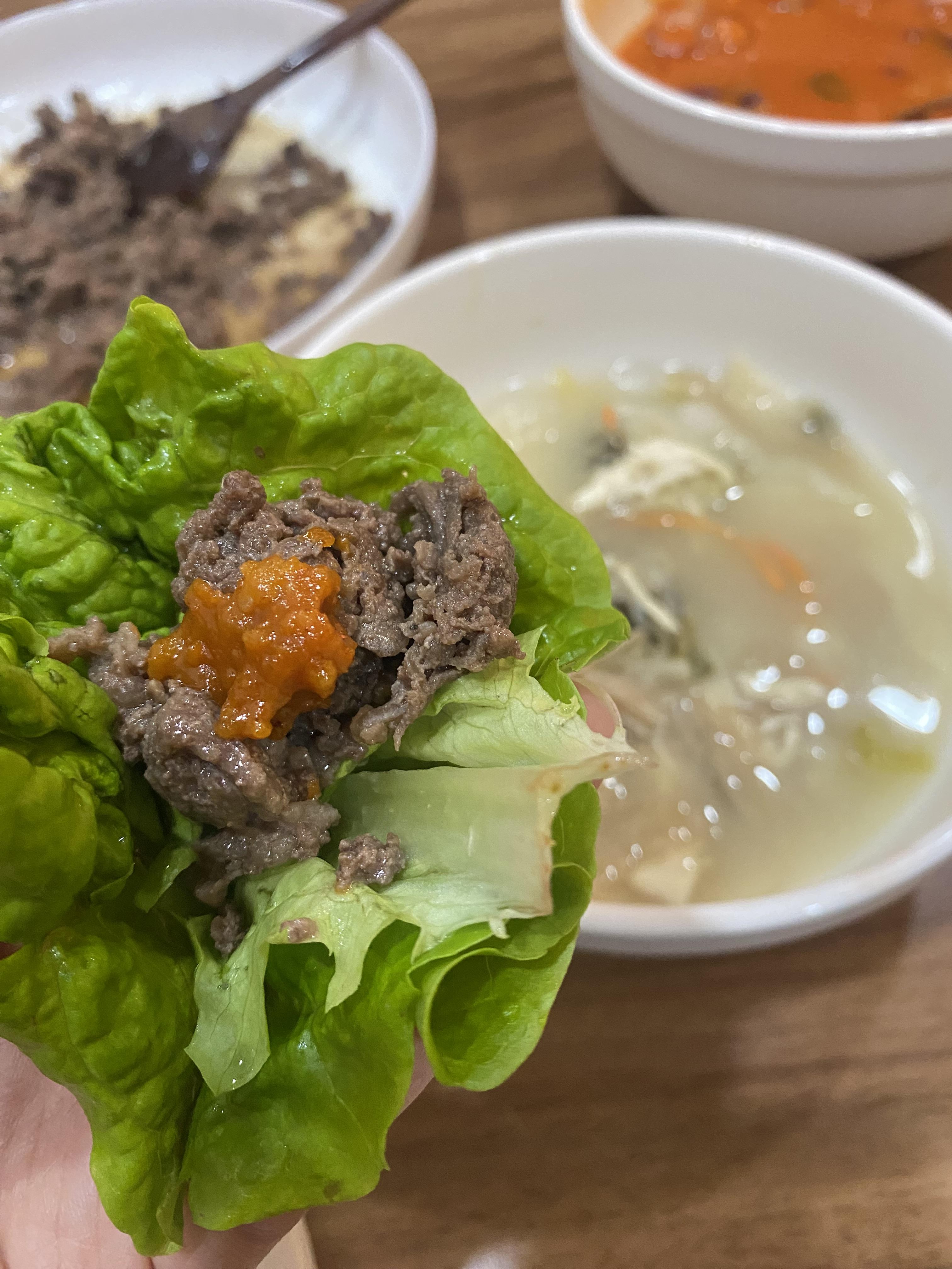 팬에다 고기 휘리릭 볶아서 상추에 한쌈 크게 싸먹으면