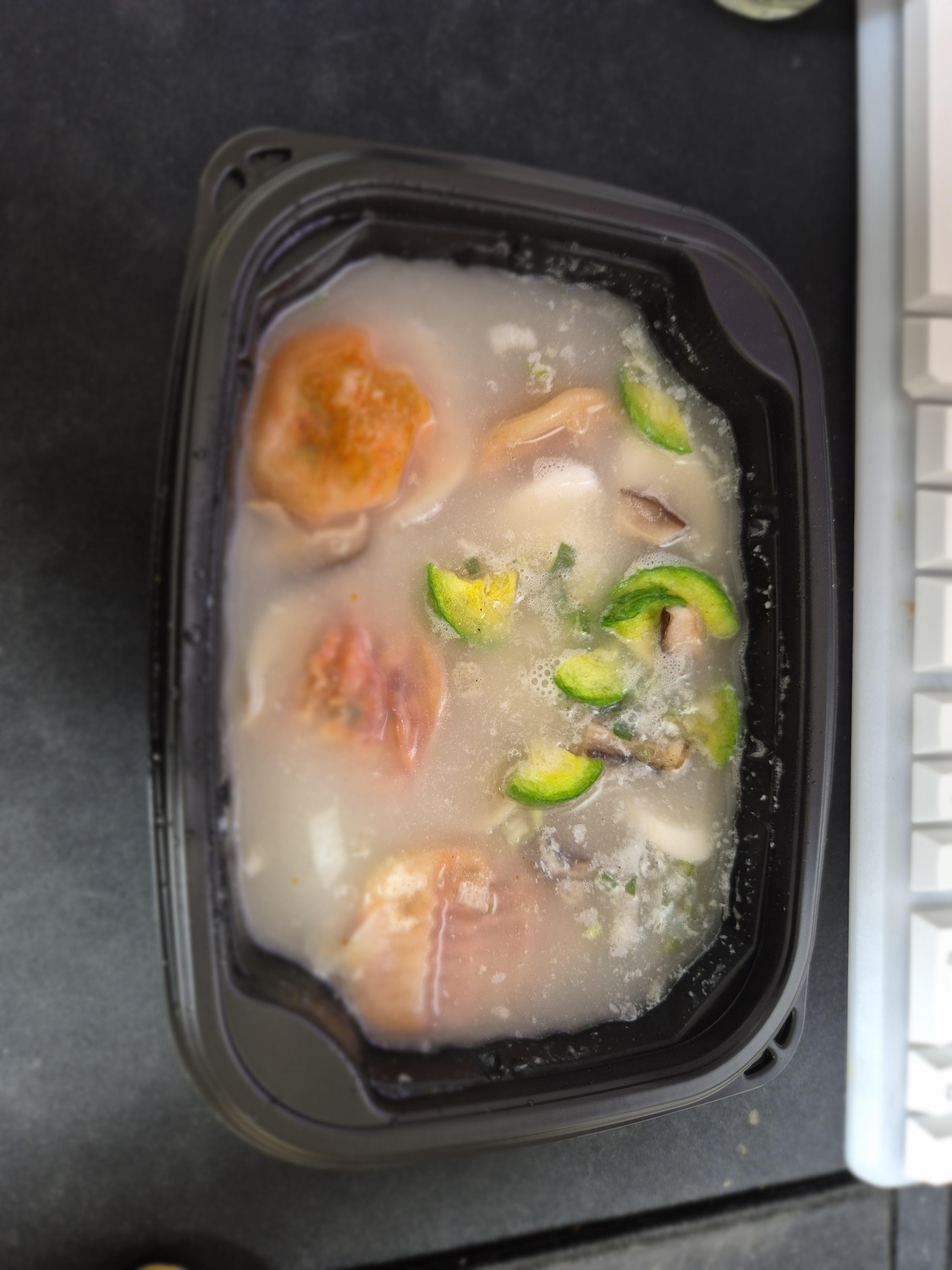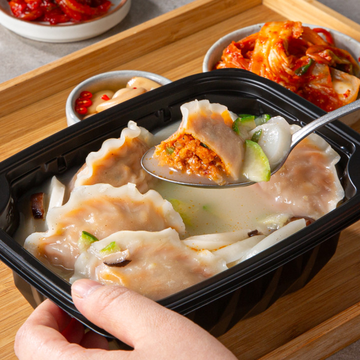 트레이에 동봉된 떡, 만두, 분말스프, 건더기 스프의 포장지를 뜯고 넣어주세요. 뜨거운 물 300ml 붓고 전자레인지에 넣어 조리해 주세요.