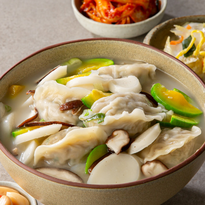 ① 고기 : 국내산 돼지고기를 넣은 잎새만두가 들어가 담백한 맛의 떡만둣국