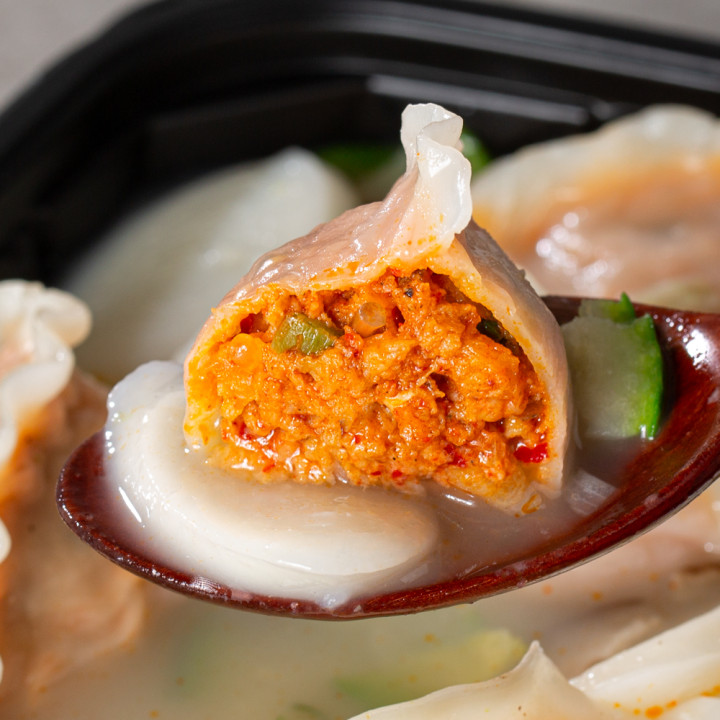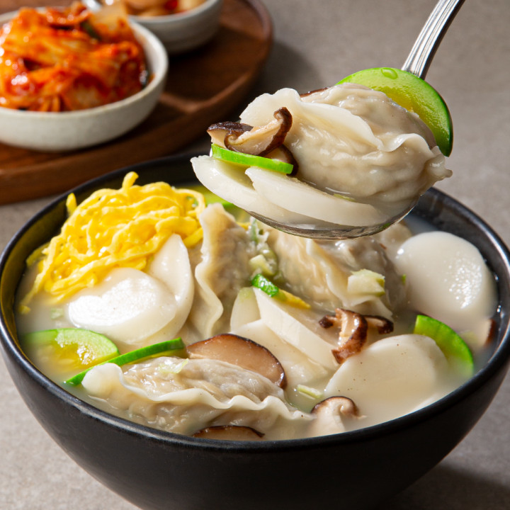 ② 김치 : 국내산 김치를 넣은 잎새만두가 들어가 살짝 매콤한 맛의 떡만둣국