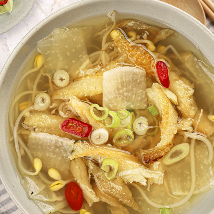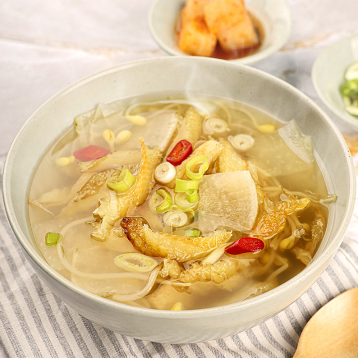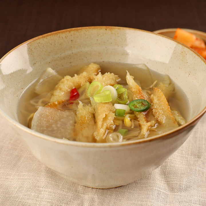 속풀이용으로는 황태 국물만한 게 없죠. 결따라 찢어 부드럽게 씹히는 황태의 감칠맛이 우러났어요. 속이 풀리는 깔끔한 국물과 시원한 무, 콩나물의 조합을 즐겨보세요. 계란이나 두부를 추가하면 또 다른 나만의 해장국이 완성돼요.