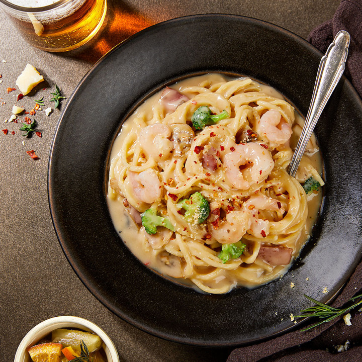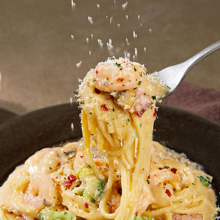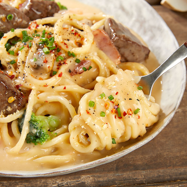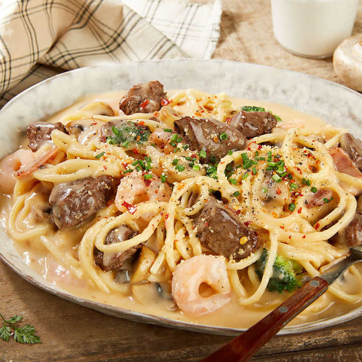 투움바와 스테이크 조합은 빠질 수 없죠. 돼지 목살을 먹기 좋게 썰어 파스타와 함께 먹으면 매력적인 레스토랑 메뉴 뚝딱!