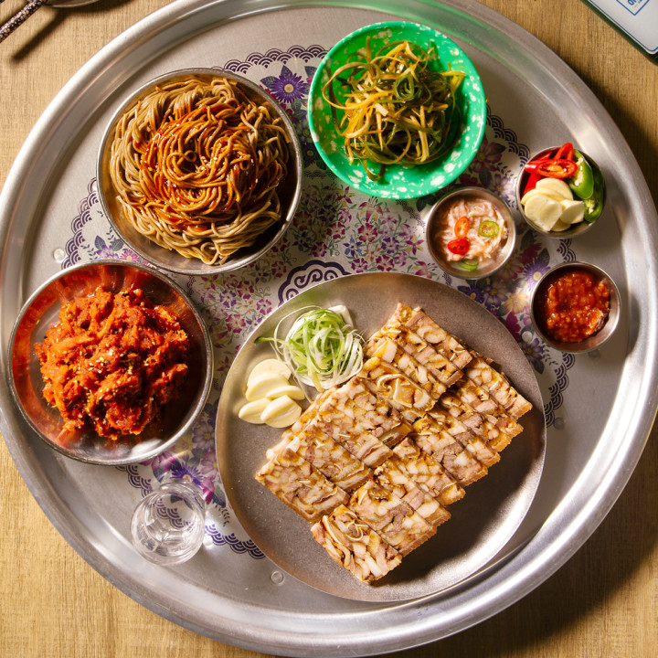 새콤달콤한 양념을 무친 막국수에 족발 편육과 함께 싸먹어 보세요.