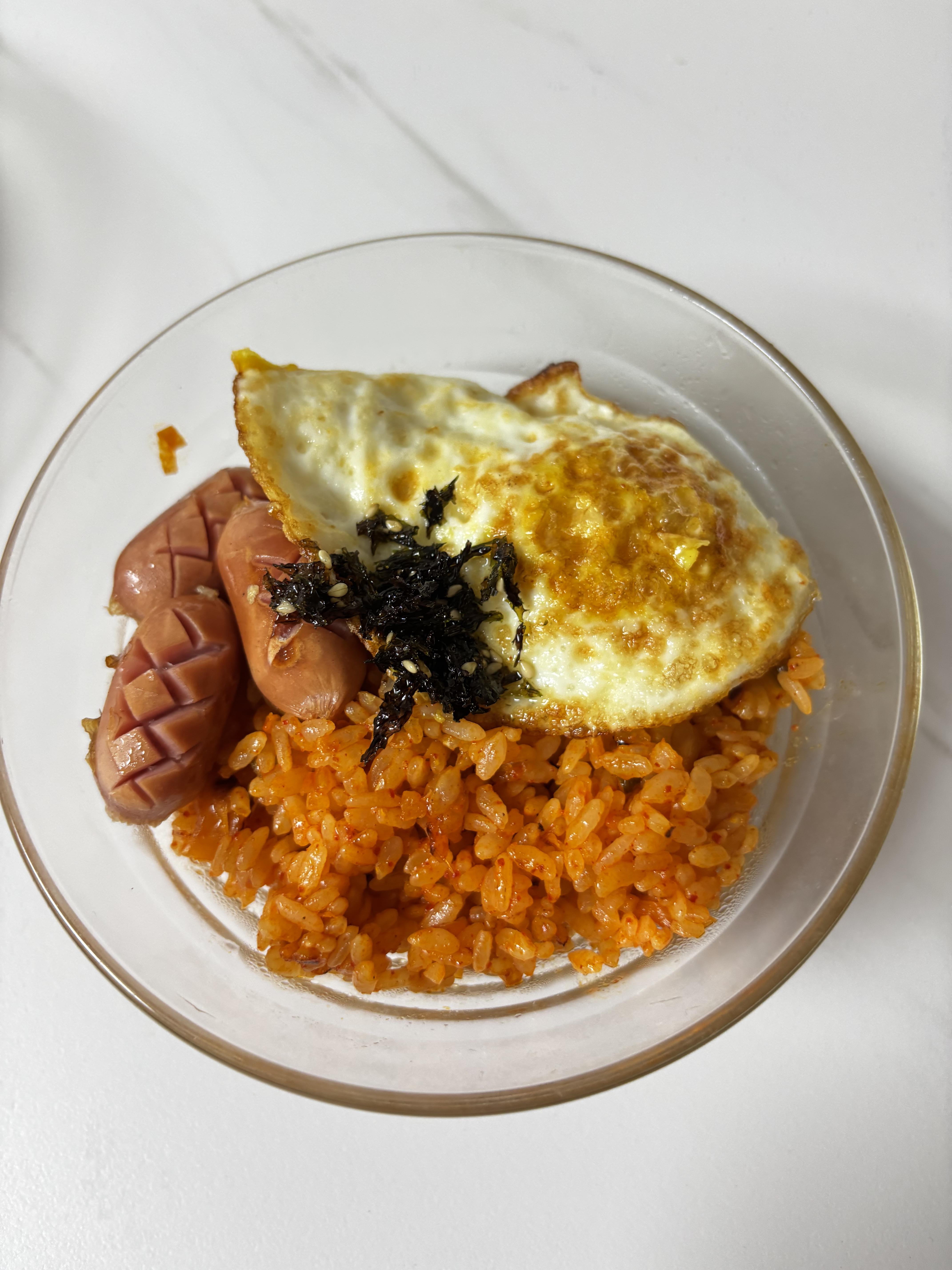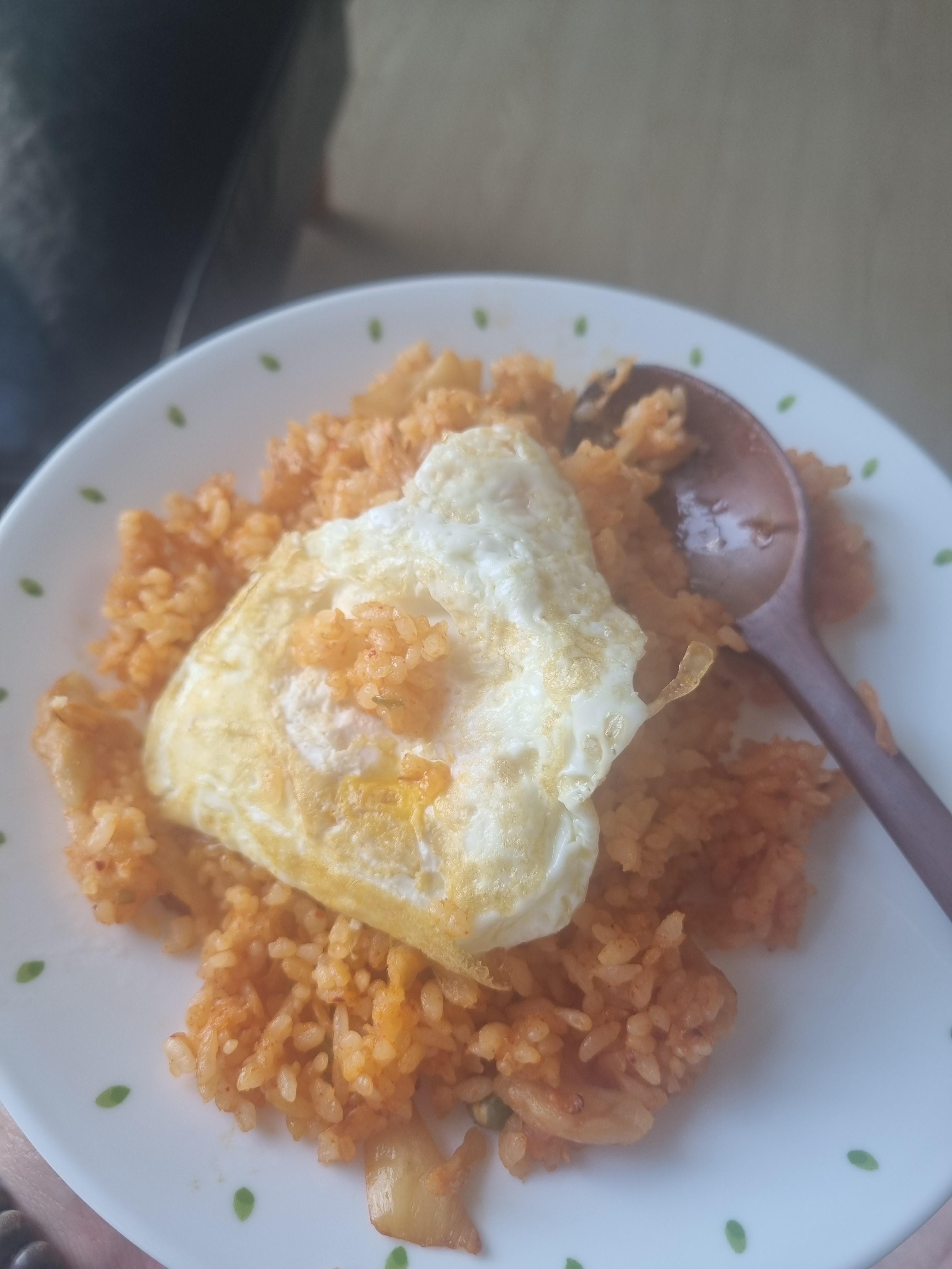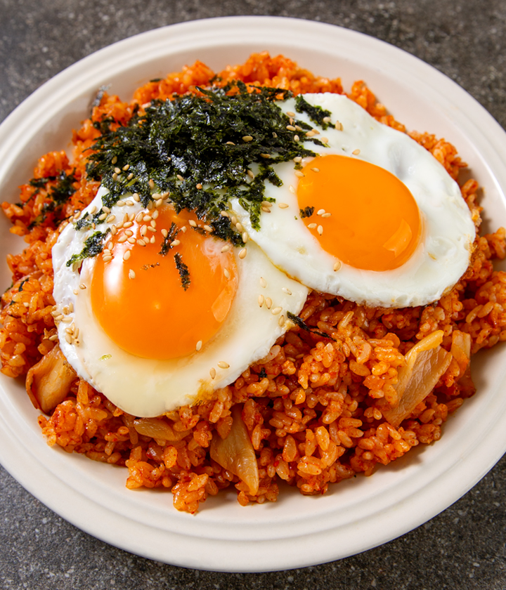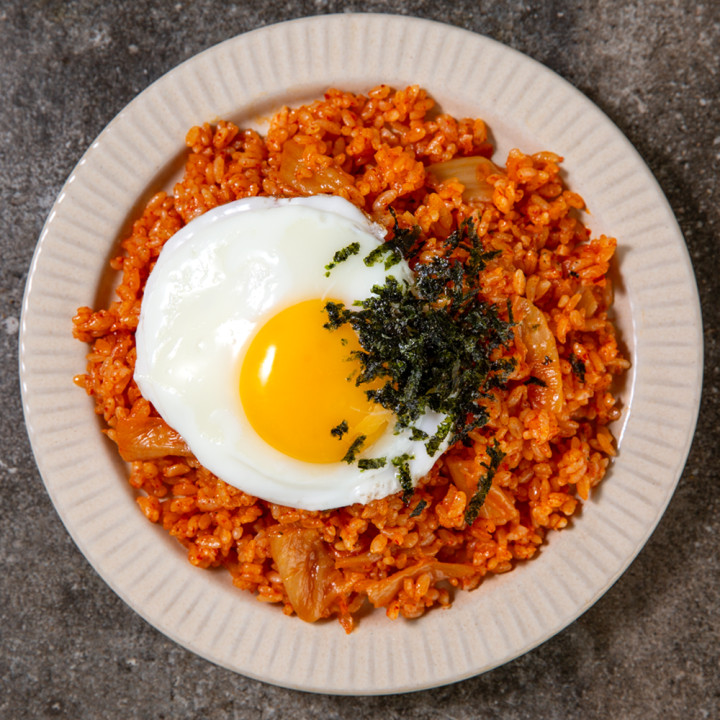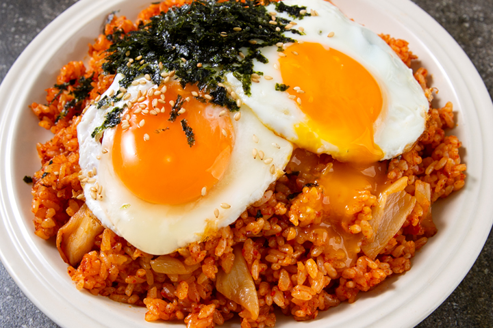맛있게 매콤한 김치볶음밥에는 계란 프라이가 빠질 수 없죠. 노른자를 톡 터뜨려 비벼 드세요.
