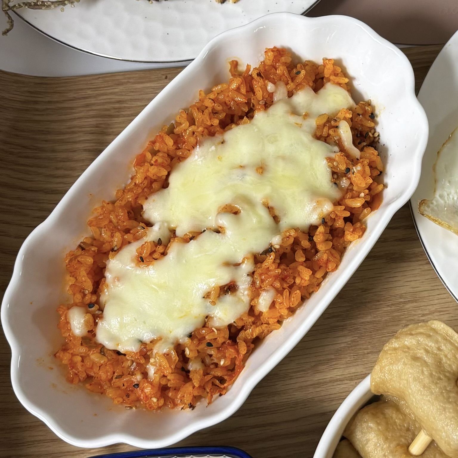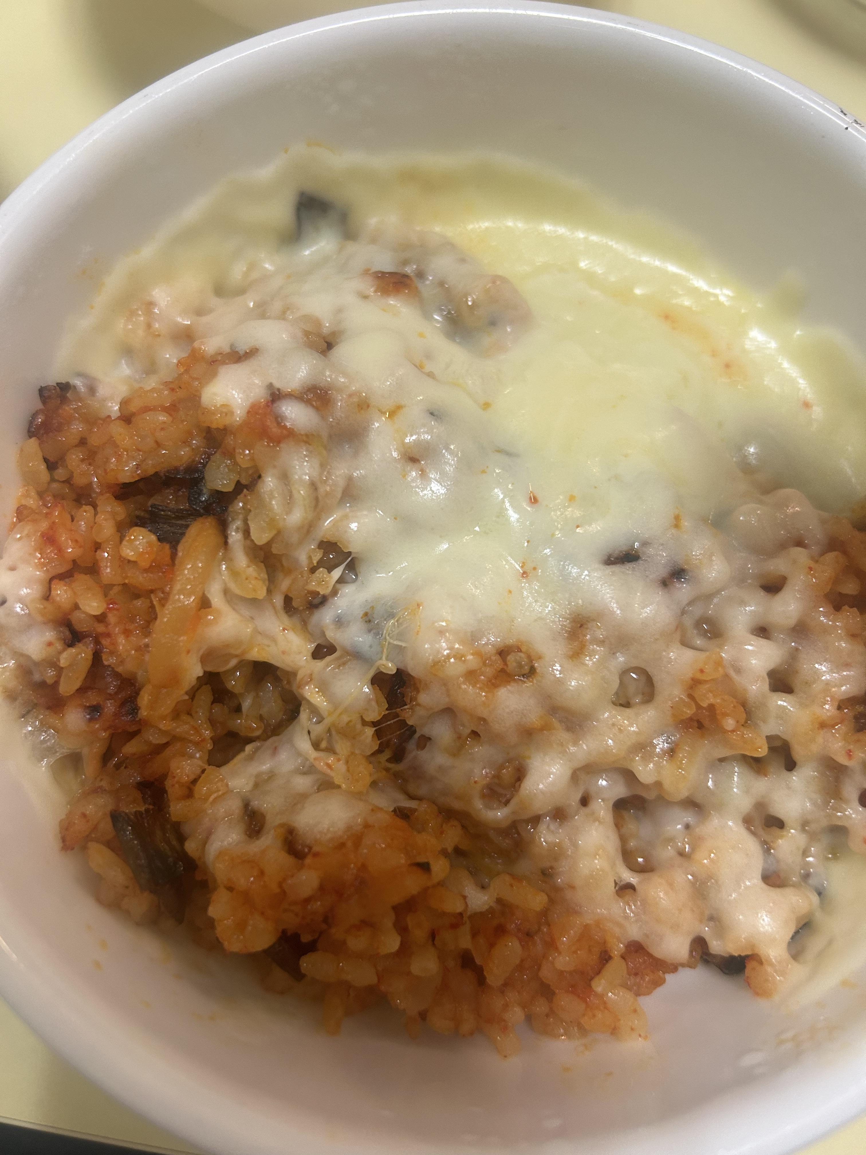 김치볶음밥 후라이팬에 볶아주고 난 뒤에 치즈 뿌려서 전자레인지에 데워먹었어요 짱 맛있음