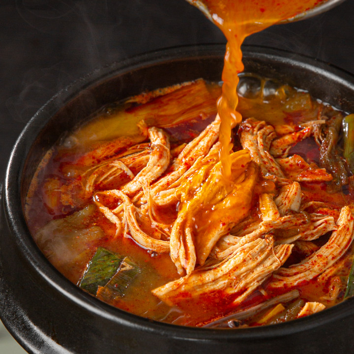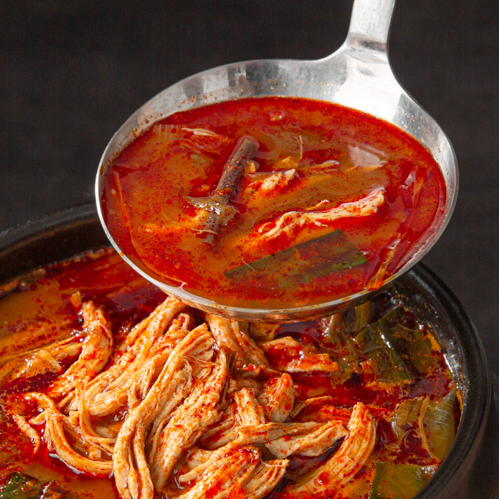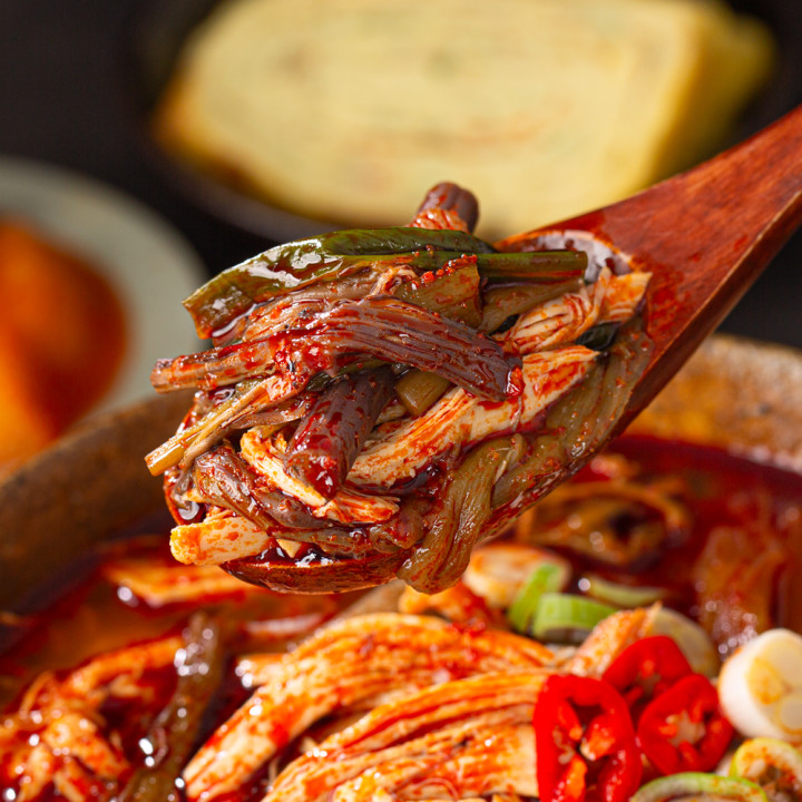 진하고 칼칼한 국물이 쌓인 피로를 확 날려줄 닭개장이에요. 닭가슴살과 토란줄기, 대파를 넣어 각각의 씹히는 매력을 살리고 맛의 풍미 또한 돋웠답니다. 5분 정도 팔팔 끓여 밥 한 공기 말아보세요.