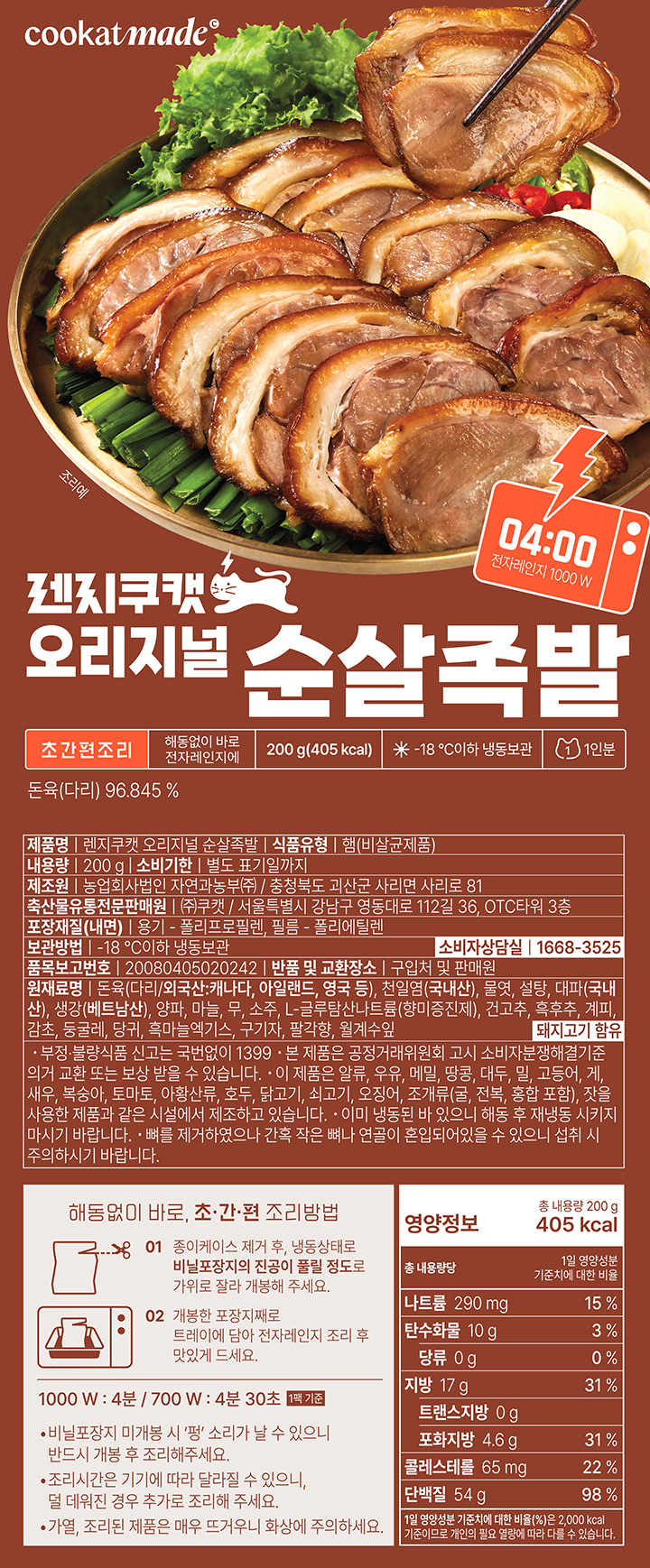 흑마늘로 잡내를 싹 잡아 담백하고 부드러운 식감의 오리지널 순살 족발이에요. 돼지 앞다리살을 사용하여 부드러운 육질과 쫄깃한 껍질을 가졌어요. 간편한 전자레인지 조리에도 잡내 없이 깔끔한 족발의 맛을 느낄 수 있답니다. 별도 판매하는 새우젓과 함께 먹으면 맛이 배가 되니 콕 찍어 드셔보세요.