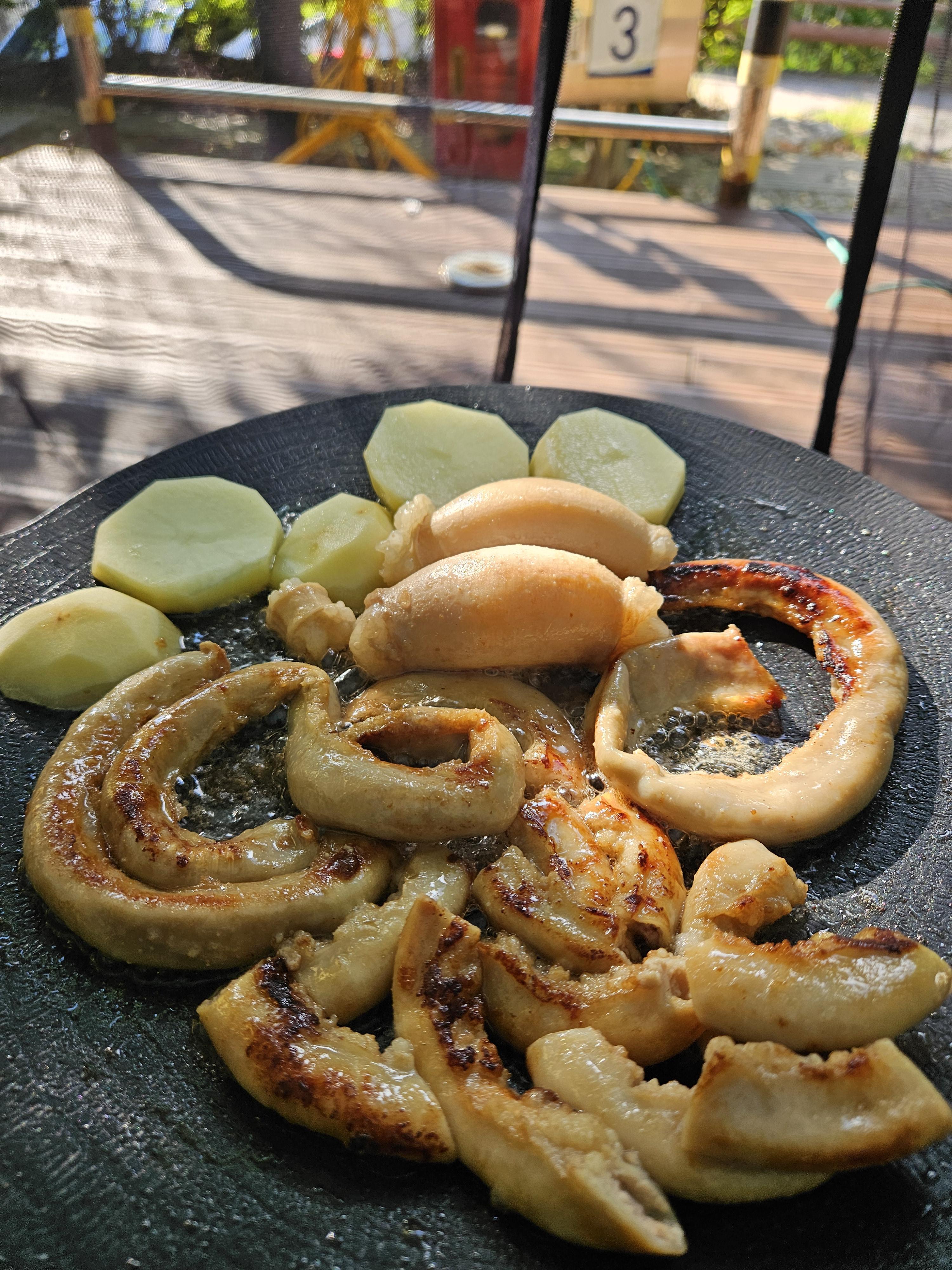 프라이팬 냉장 해동 또는 차가운 물에 담가 해동시켜주세요. 완전 해동된 제품을 달궈진 프라이팬에 가닥가닥 풀어 중약 불에 굽다가 노릇해지면 뒤집어 구워주세요. 다 구운 후 먹기 좋은 크기로 잘라주세요. * 구워진 후 잘라 주셔야 곱이 빠져나오지 않습니다.