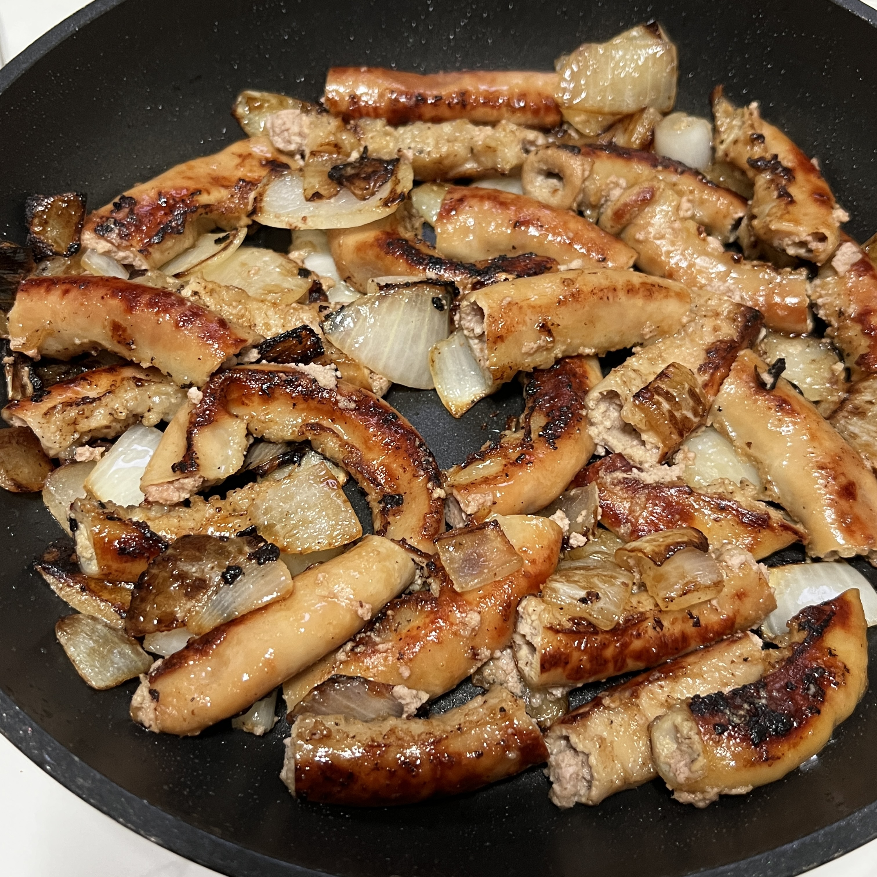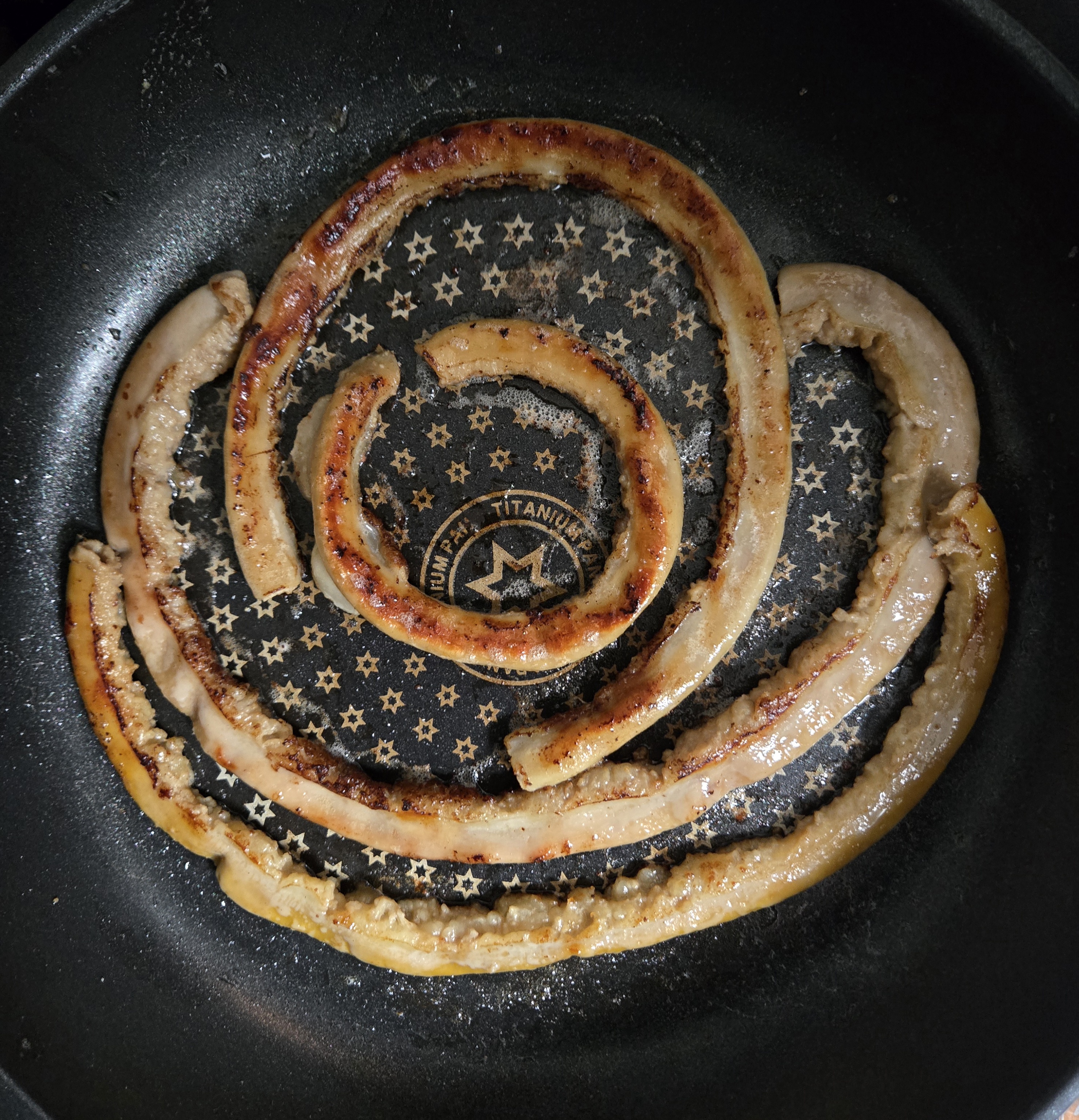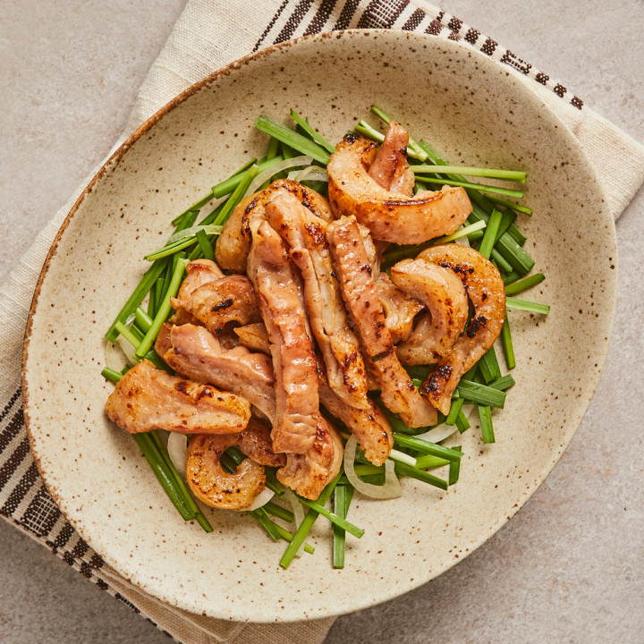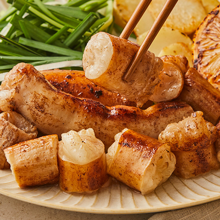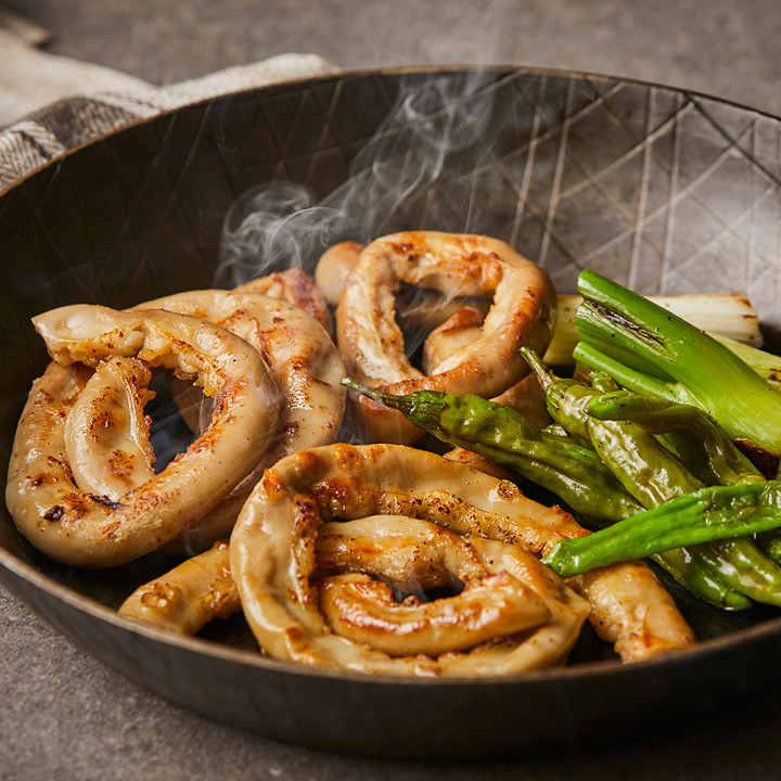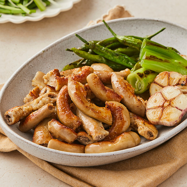 프라이팬 냉장 해동 또는 차가운 물에 담가 해동시켜주세요. 완전 해동된 제품을 달궈진 프라이팬에 가닥가닥 풀어 중약 불에 굽다가 노릇해지면 뒤집어 구워주세요. 다 구운 후 먹기 좋은 크기로 잘라주세요. * 구워진 후 잘라 주셔야 곱이 빠져나오지 않습니다.