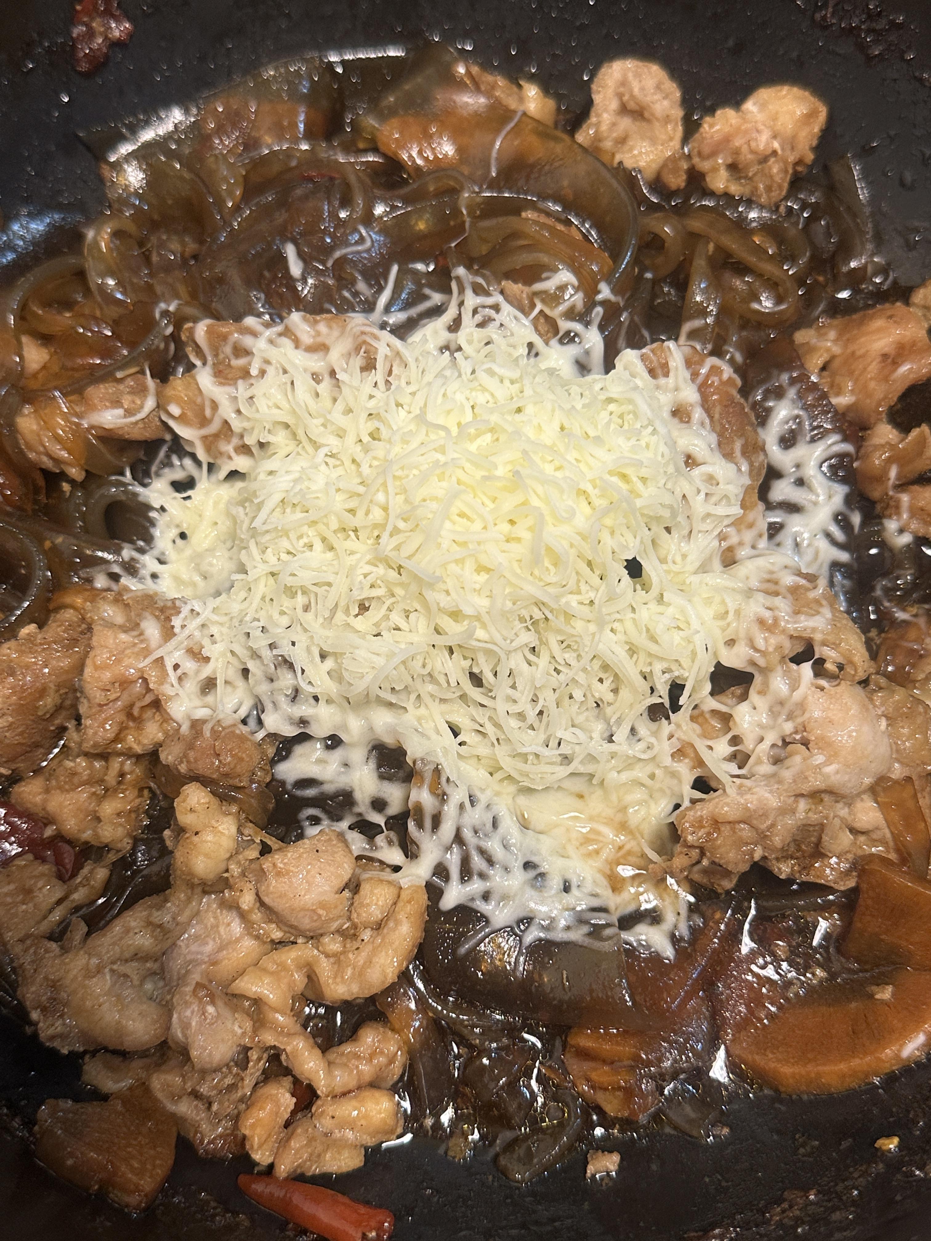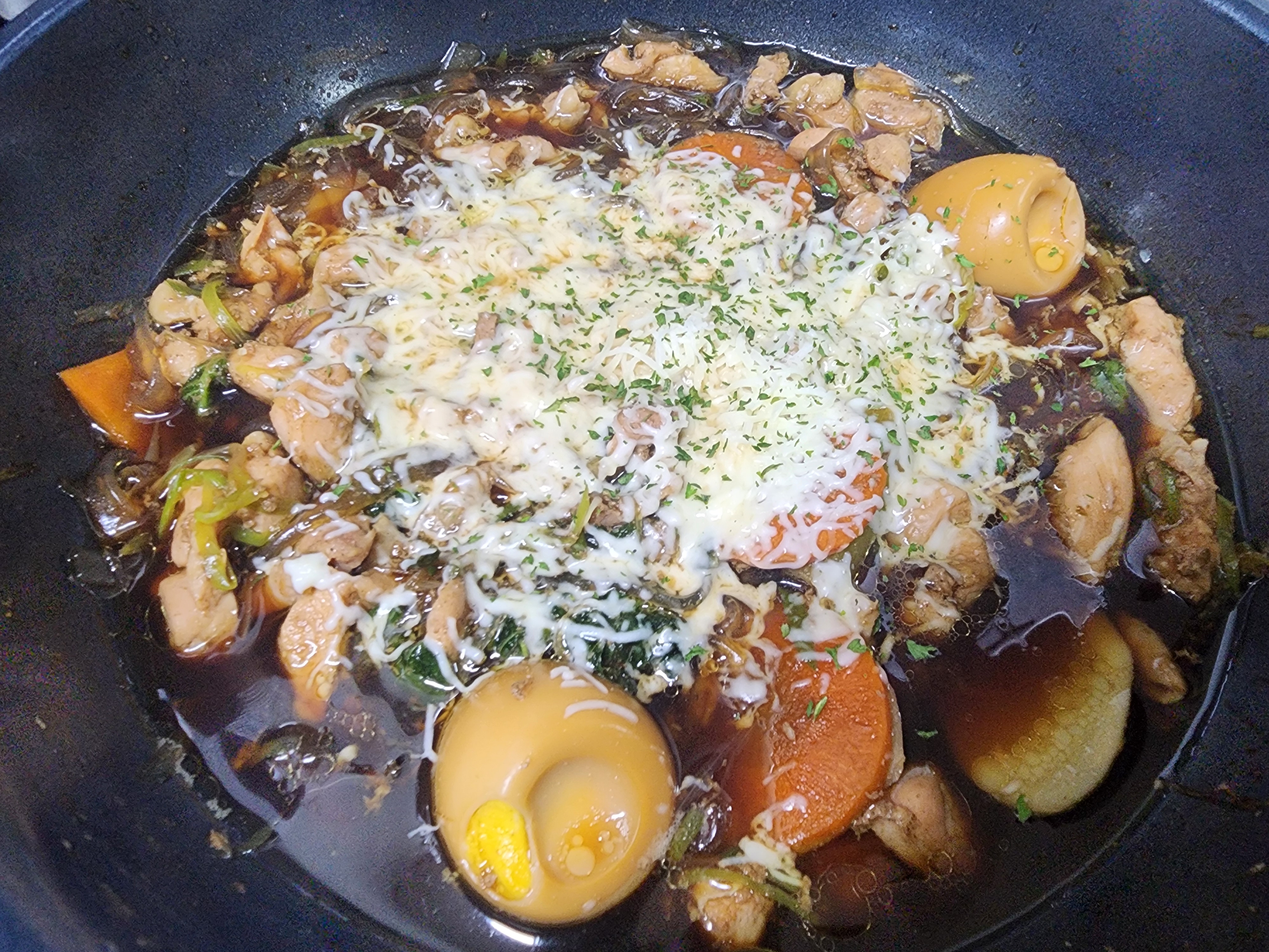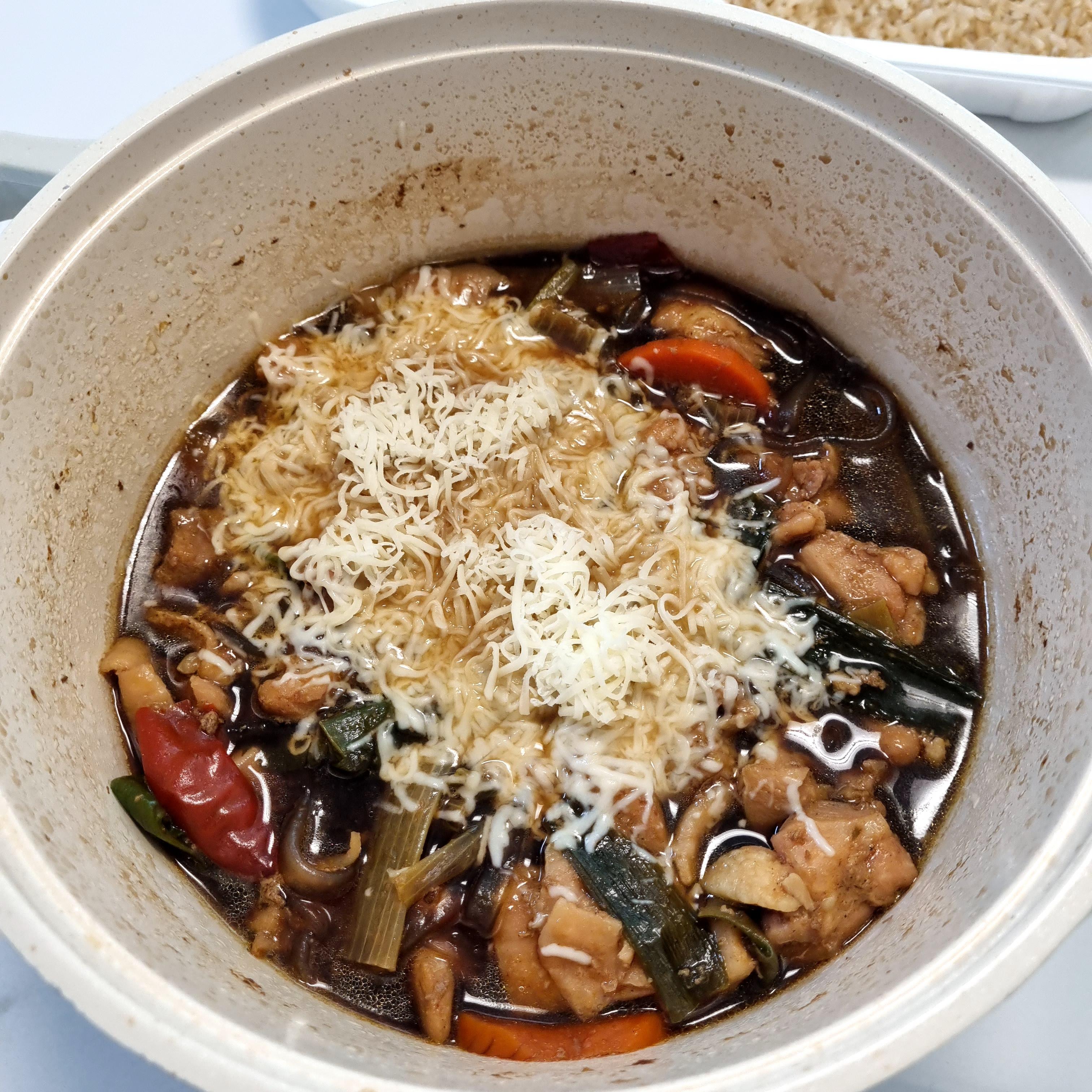 불린 당면을 씻어 준비해 주세요. 냄비에 닭다리살, 야채, 소스를 넣고 끓입니다. 고기가 익으면 불린 당면을 넣고 끓인 뒤 완성합니다.