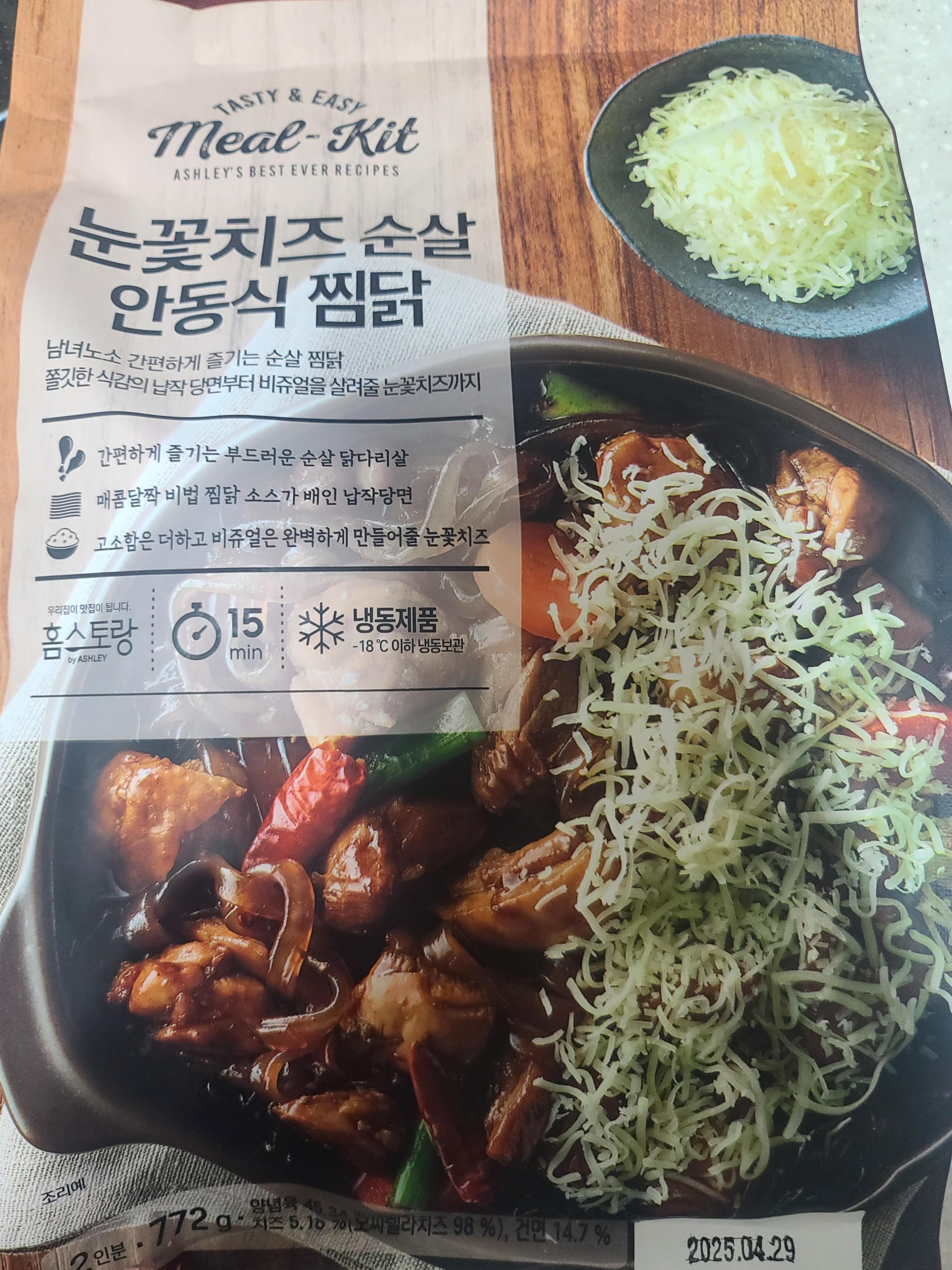 찜닭을 워낙 좋아하는데 애슐리랑 눈꽃치즈란 말에 끌려서.. 포장도 고급지지만.. 맛도 너무 맛있어요.. 동봉된 치즈가 있어서 조리후에 위에 뿌려만줘도 근사해집니다~~ 건고추가 들어지만 맵지않고요. 당면양도 넉넉해서 추가안하길 잘했어요.. 좀 여유있게 국물을 조려주니 더 맛나네요~ 재구매템이에요