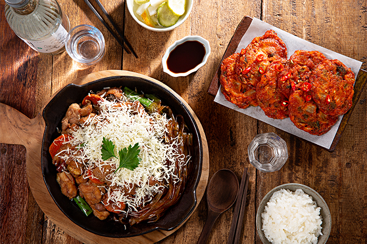 한식 버전 홈파티를 제대로 즐기고 싶다면 화끈한 실비김치전을 곁들여 보세요. 전 위에 찜닭을 올려 쌈처럼 싸먹어도 맛있죠.