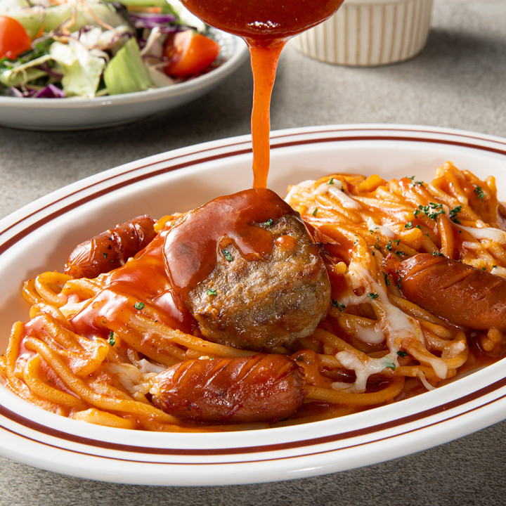 매콤한 소스, 파스타면, 모짜렐라 치즈, 토핑(햄버거,소세지)까지...