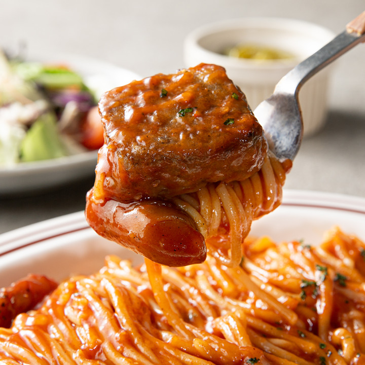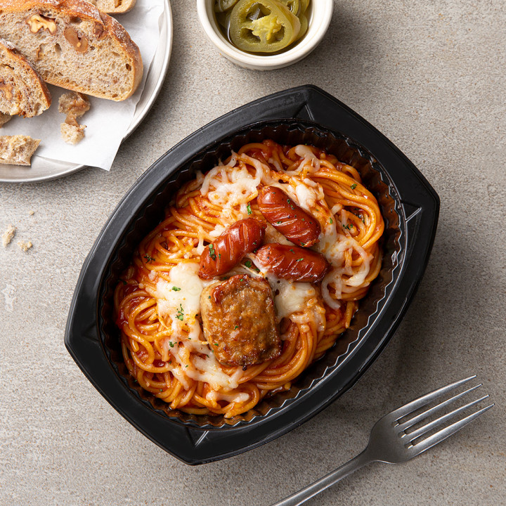 전자렌지에 데워 비닐포장을 열면.. 코끝을 자극하는 강한 풍미가 식욕을 끌어올려요.. 매콤한 토마토소스로 감싼 스파게티+비엔나소시지+미니 함박스테이크+치즈.. 정말 강력한 조합이죠^^ 먹어보면 알아요~ 정말 진합니다~~