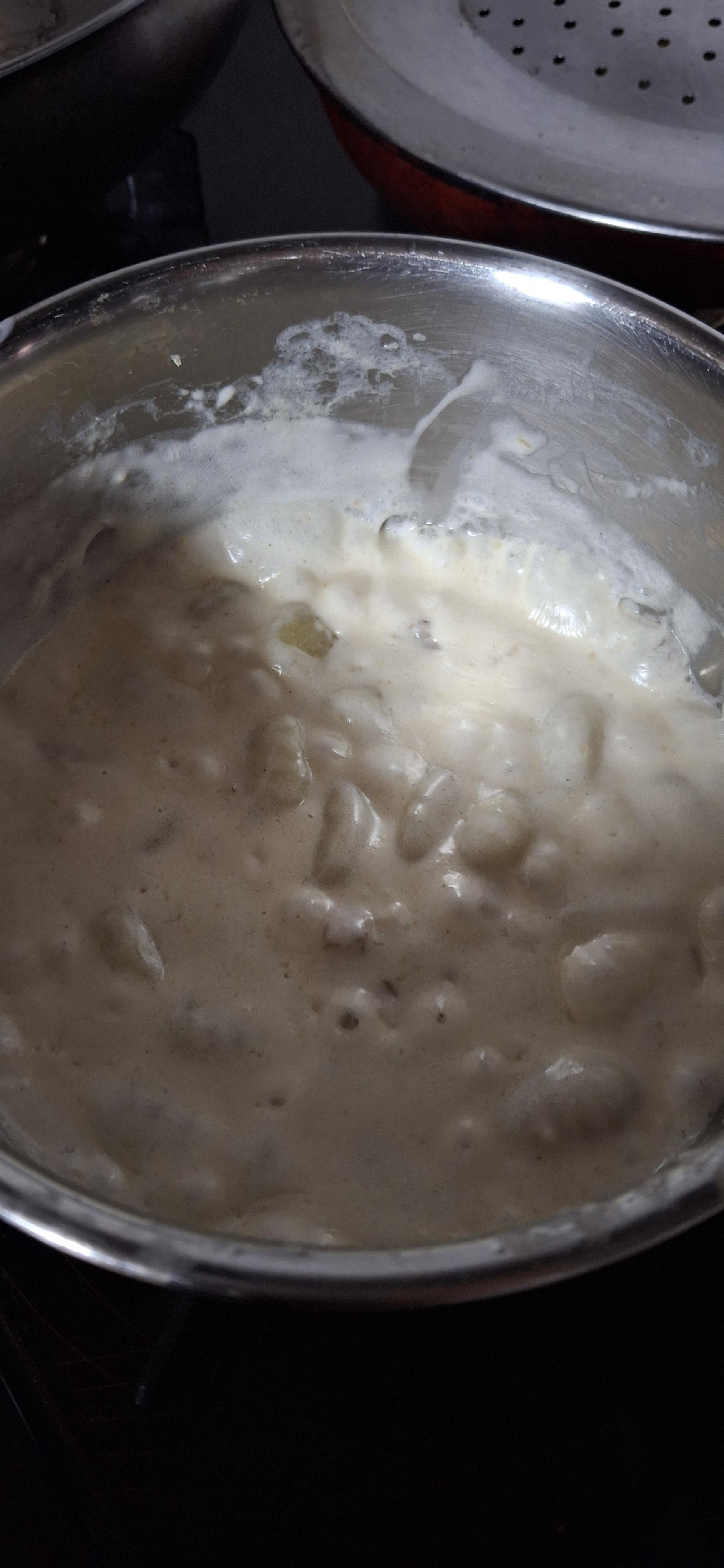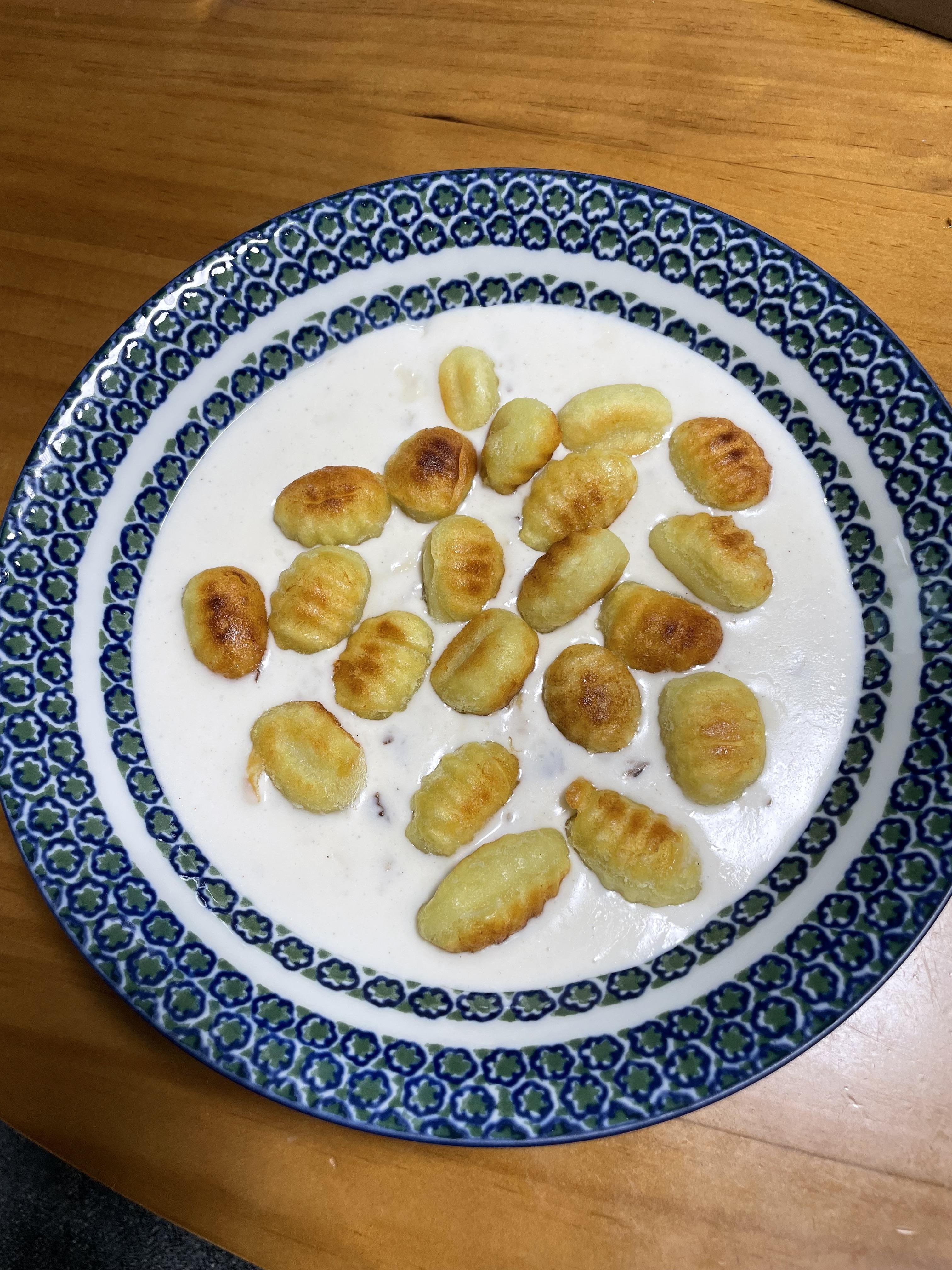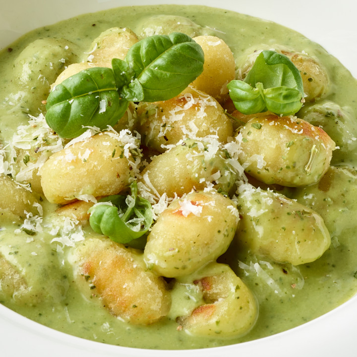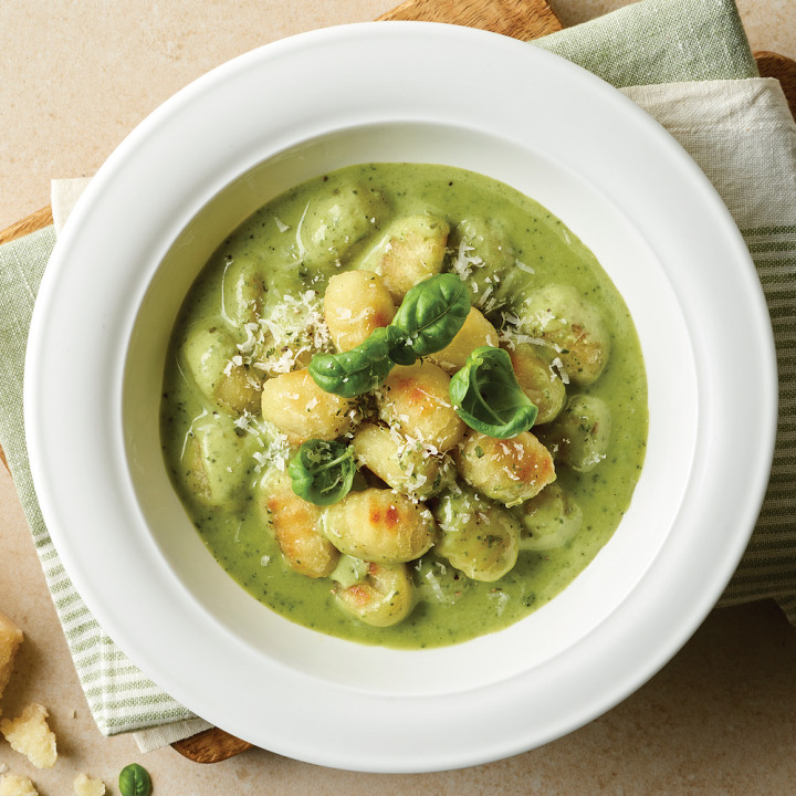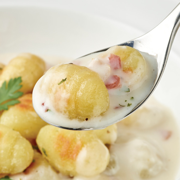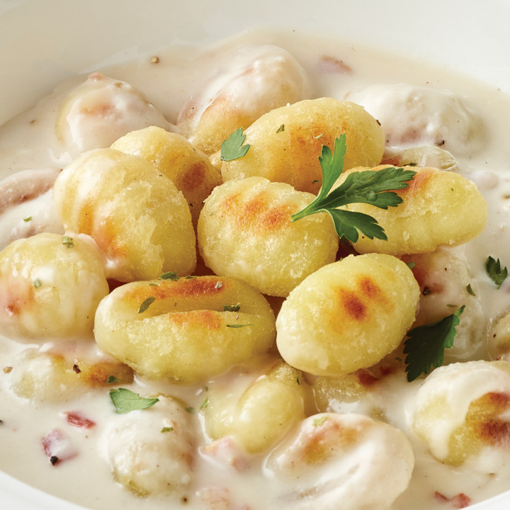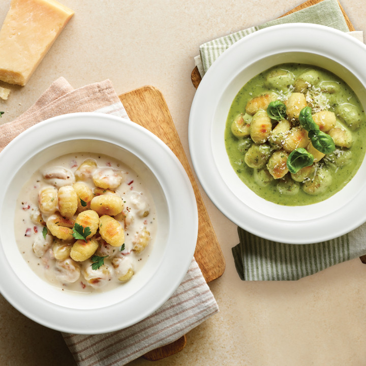 소스는 흐르는 물에서 10분 이상 완전히 해동해 주세요. 냉동 상태의 뇨끼를 끓는 물에 1분간 삶은 뒤 물기를 빼주세요. 중불로 달군 팬에 오일을 넉넉히 두르고, 삶은 뇨끼를 노릇해질 때까지 앞뒤로 2분 정도 구워 접시에 담아주세요. 팬에 해동된 소스를 넣고 중약불에서 30~40초간 저으면 끓여주세요. 취향에 맞게 구워진 뇨끼 위에 소스를 붓거나 찍어드세요.