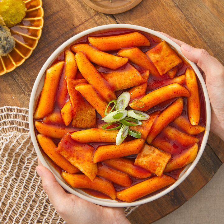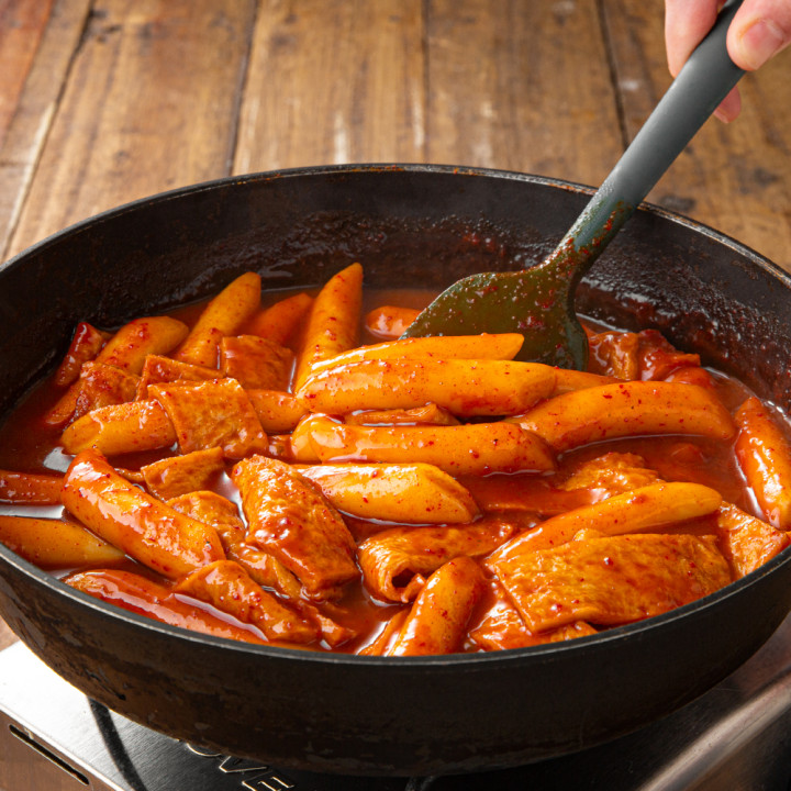 조리 전 냉동된 떡을 찬물에 헹구어 해동해 주세요. 냄비에 소스와 물 500ml를 붓고 떡과 어묵을 넣어 끓입니다. 약 5~6분간 조리하며 떡이 부풀면 불을 끄고 30초 정도 저어주세요.