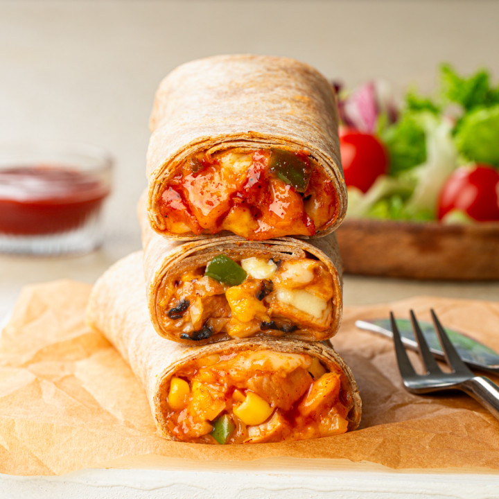 샐러드 저당 닭가슴살 브리또와 신선한 샐러드로 맛있고 균형 잡힌 식단을 즐겨보세요.