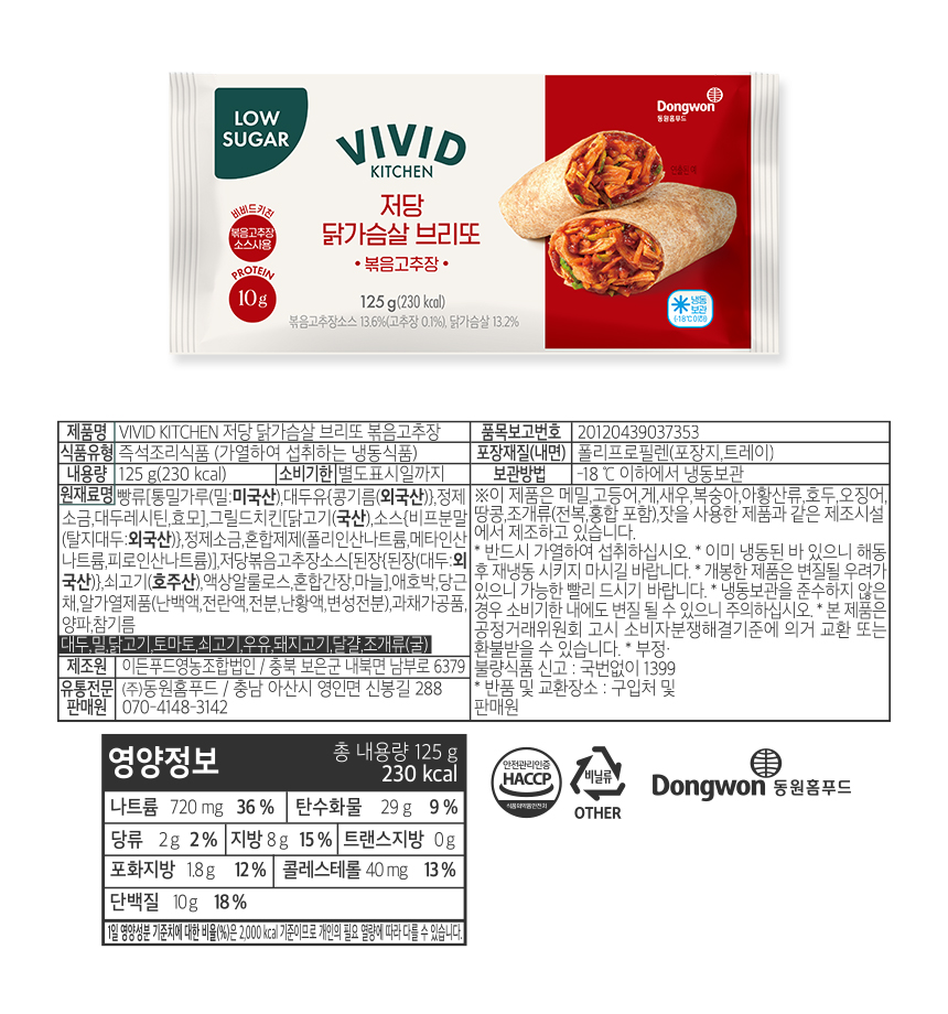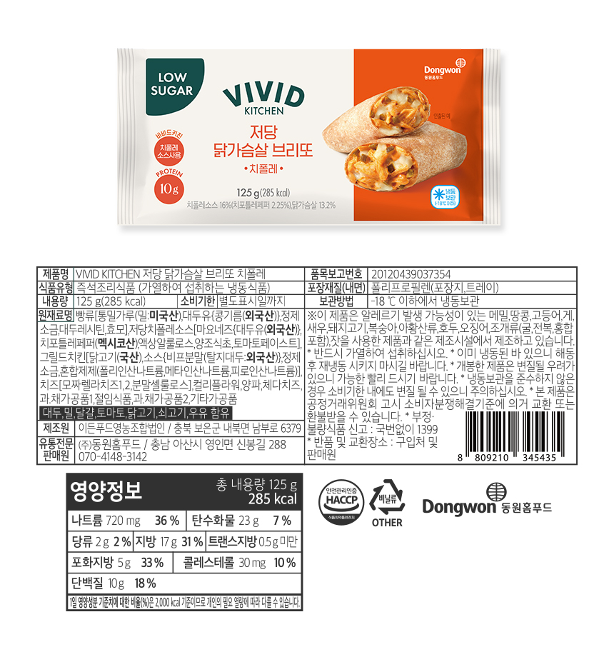 맛있는 비비드키친 저칼로리 소스로 만든 저당 브리또! 닭 가슴살과 계란을 듬뿍 담아 든든하게 단백질도 채웠어요. 밥 대신 컬리플라워 라이스를, 밀가루 대신 통밀 또띠아를 사용해 더욱 가볍게 완성시켰죠. 식사 대용은 물론, 간식으로도 걱정 없이 즐길 수 있는 가벼운 저당 브리또를 만나보세요.