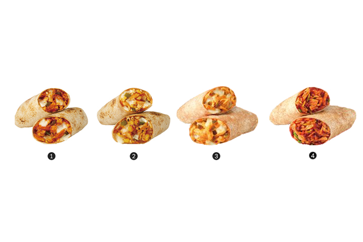 ① 숯불매콤 : 250kcal / 당 0g / 단백질 13g - 비비드키친 저칼로리 숯불매콤소스, 통밀또띠아, 닭가슴살, 계란, 모짜렐라치즈, 컬리플라워라이스, 빵가루, 할라피뇨, 청피망 ② 양념치킨 : 235kcal / 당 0g / 단백질 12g - 비비드키친 저칼로리 양념치킨소스, 통밀또띠아, 닭가슴살, 계란, 컬리플라워라이스, 모짜렐라치즈, 양파, 청피망, 옥수수 ③ 치폴레 : 285kcal / 당 2g / 단백질 10g - 비비드키친 저당 치폴레소스, 닭가슴살, 컬리플라워라이스, 모짜렐라, 체다 치즈 ④ 볶음고추장 : 230kcal / 당 2g / 단백질 10g - 비비드키친 저당 볶음고추장, 애호박, 당근, 계란, 컬리플라워라이스