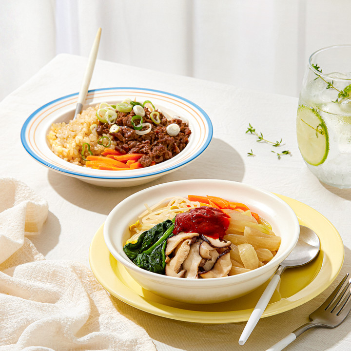 ① 소불고기 : 달짝지근한 간장 양념 소불고기와 큼직한 채소를 곁들인 든든한 비빔밥