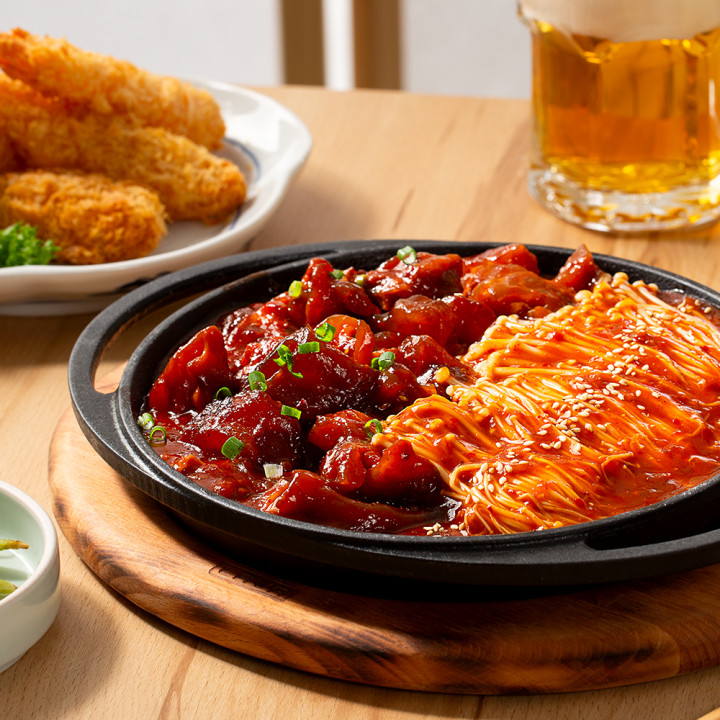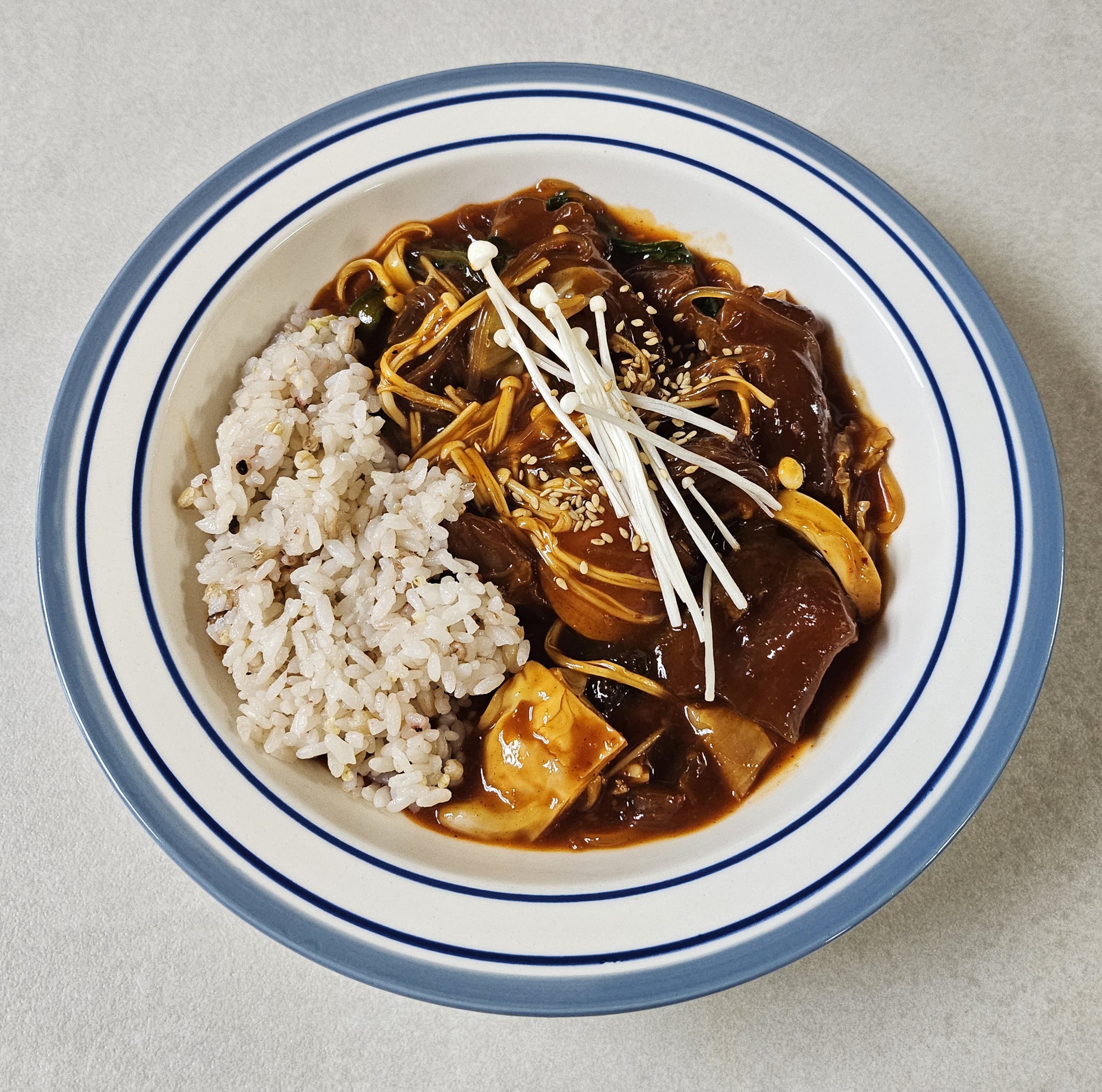 쫀득한 스지와 아삭한 팽이버섯이 어우러져 식감이 두 배 더 살아나는 조합이에요.