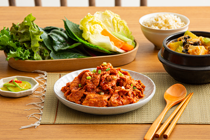② 제육볶음 : 지방이 적고 쫄깃한 국내산 돼지 뒷다리살과 저당 고추장 양념을 사용한 반찬