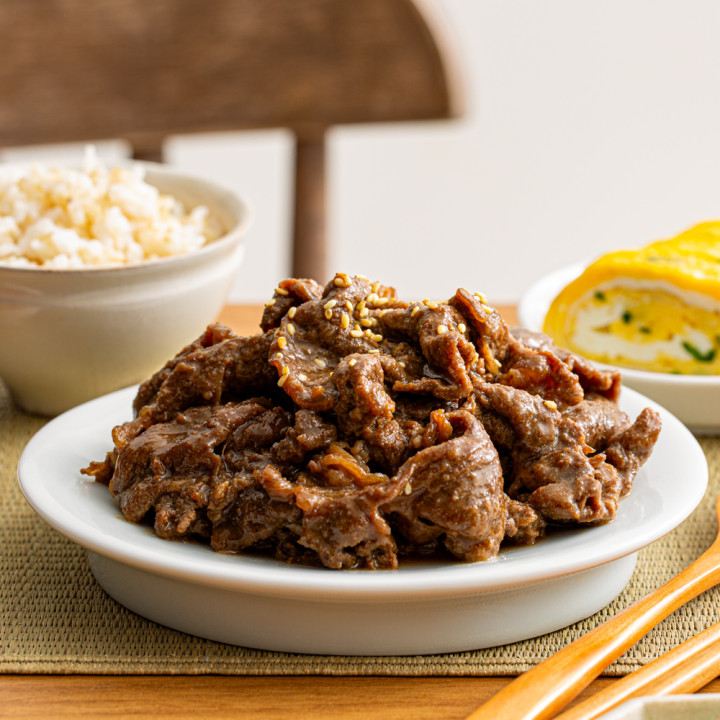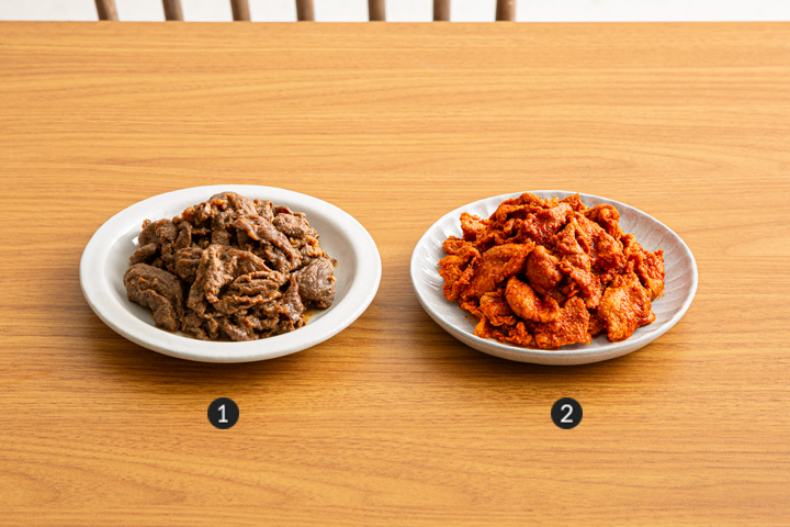 ① 소불고기 : 담백한 호주산 소 앞다리살과 저당 불고기 양념을 사용한 반찬