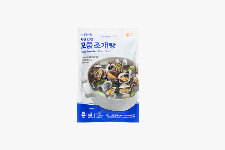 해동된 조개를 흐르는 물에 가볍게 씻어주세요. 냄비에 물 700ml와 해물육수를 넣고 끓여주세요. 끓기 시작하면 조개와 야채를 넣어주세요. 4분간 더 끓여주시면 완성입니다.