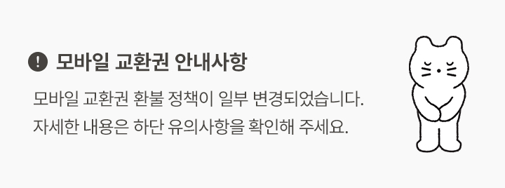 ✅ 모바일 교환권 특성상 수신자 연락처 오기입으로 인한 재발송/취소/환불이 불가합니다. 주문 전 배송지 및 수령 정보에 등록된 연락처를 반드시 확인하세요.