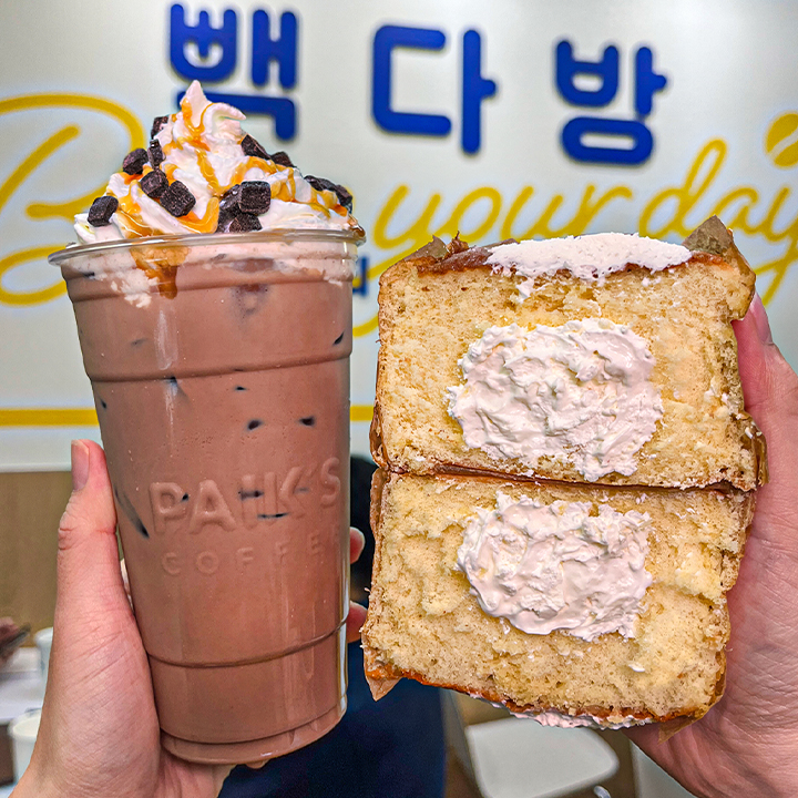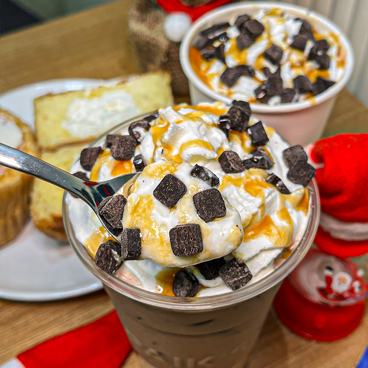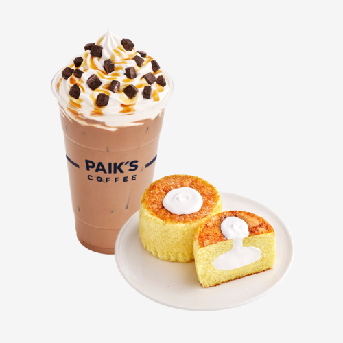✅ 구성 : 메리 더블넛츠 초코라떼 1잔(HOT/ICED 중 택 1) + 생크림 카스텔라 1개 SET