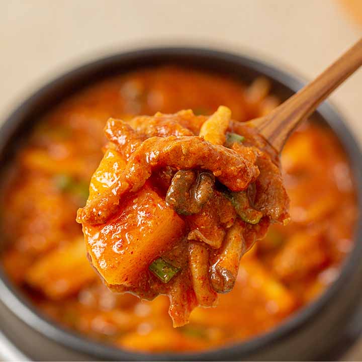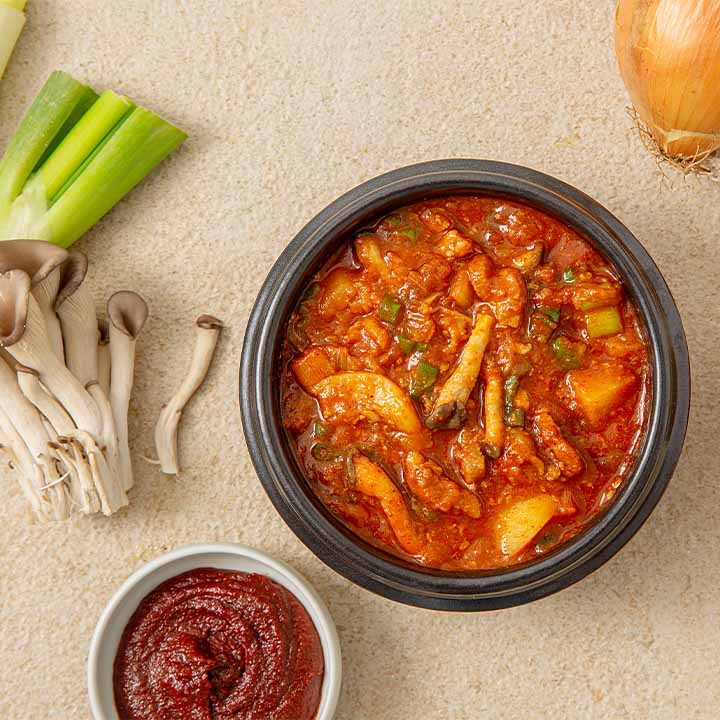 ② 고추장돼지짜글이 : 포슬포슬한 감자와 쫄깃한 느타리버섯으로 씹는 식감을 더하고 2가지 고춧가루를 사용해 매운맛을 살린 짜글이
