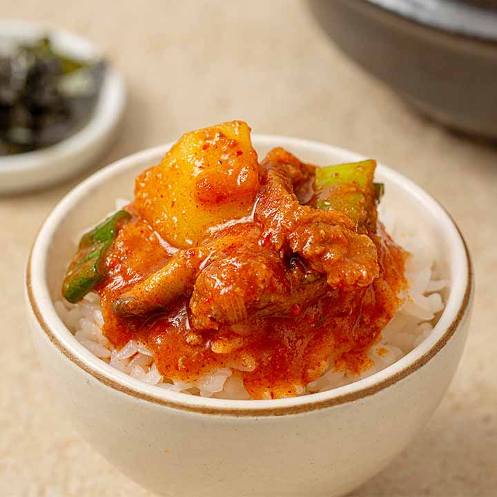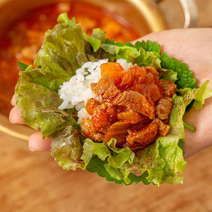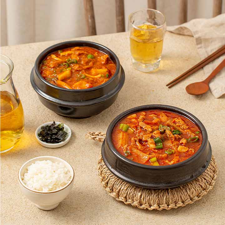 푸짐하여 밥 위에 듬뿍 올려 먹기 좋답니다. 지방이 적고 고소한 국내산 돼지고기 앞다리살을 사용해 끓이면 끓일수록 진한 감칠맛을 느낄 수 있어요. 짜글이 하나만 있으면 식사 준비 끝! 열 가지 반찬 부럽지 않답니다.