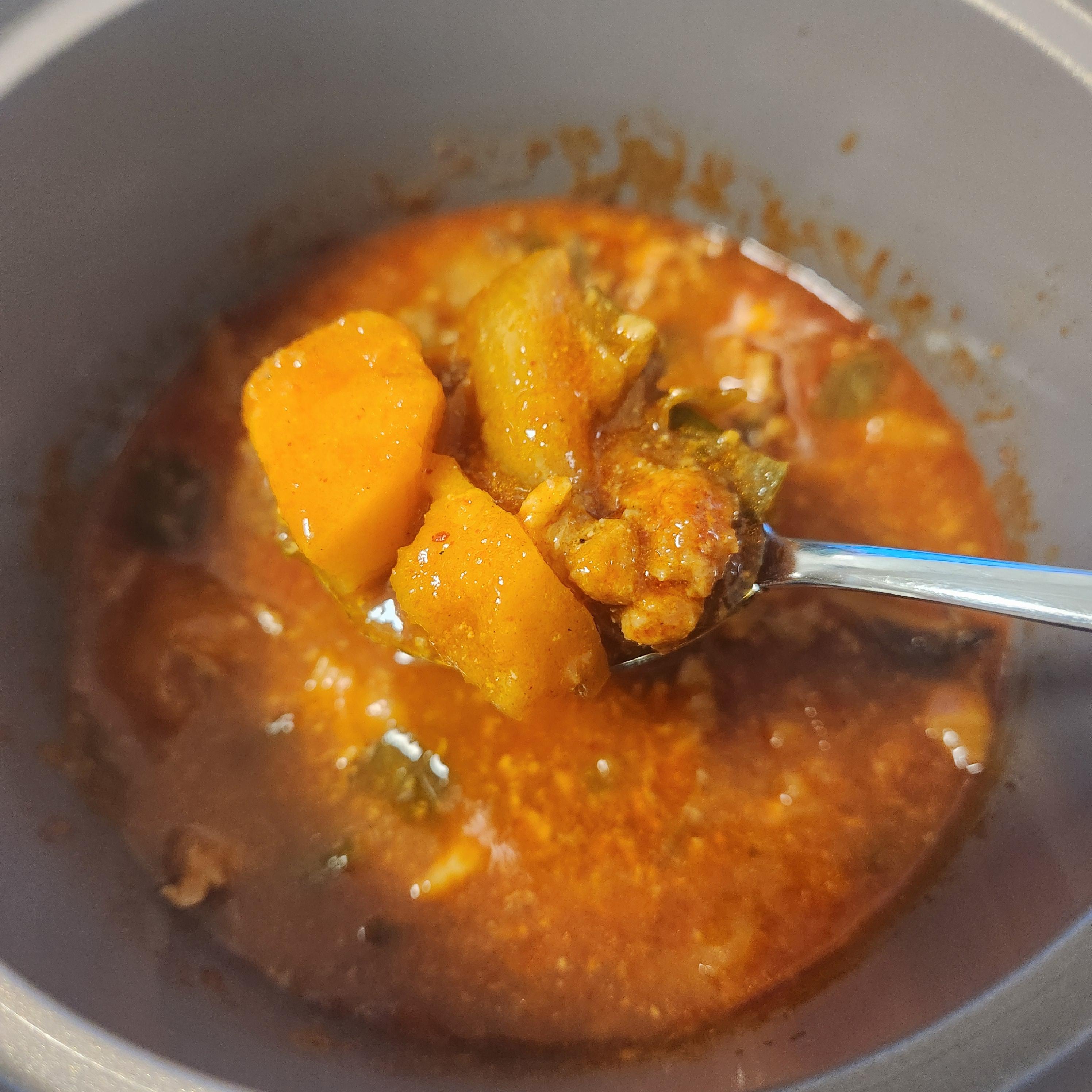돼지고기, 양파, 대파 등 재료를 아낌없이 사용해 만든 짜글이에요. 총중량의 절반 이상이 건더기일 정도로