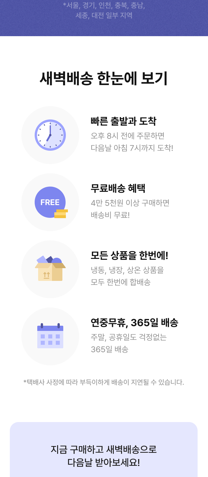 - 새벽배송 가능 지역이더라도 새벽에 출입이 원활하지 않은 관공서, 군사지역, 학교, 병원, 시장, 백화점, 산업단지 등의 경우 새벽배송이 불가합니다.