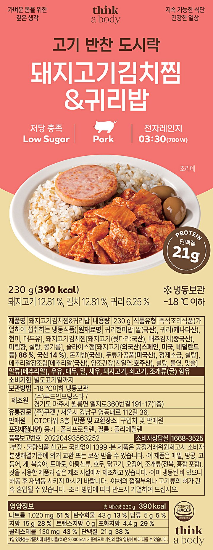 작은 햄이 하나 더 들어있어요 찜닭&영양잡곡밥, 돼지고기김치찜&귀리밥의 경우 제품당 무게를 균일하게 맞추기 위해 두 조각의 작은 햄이 있을 수 있어요.