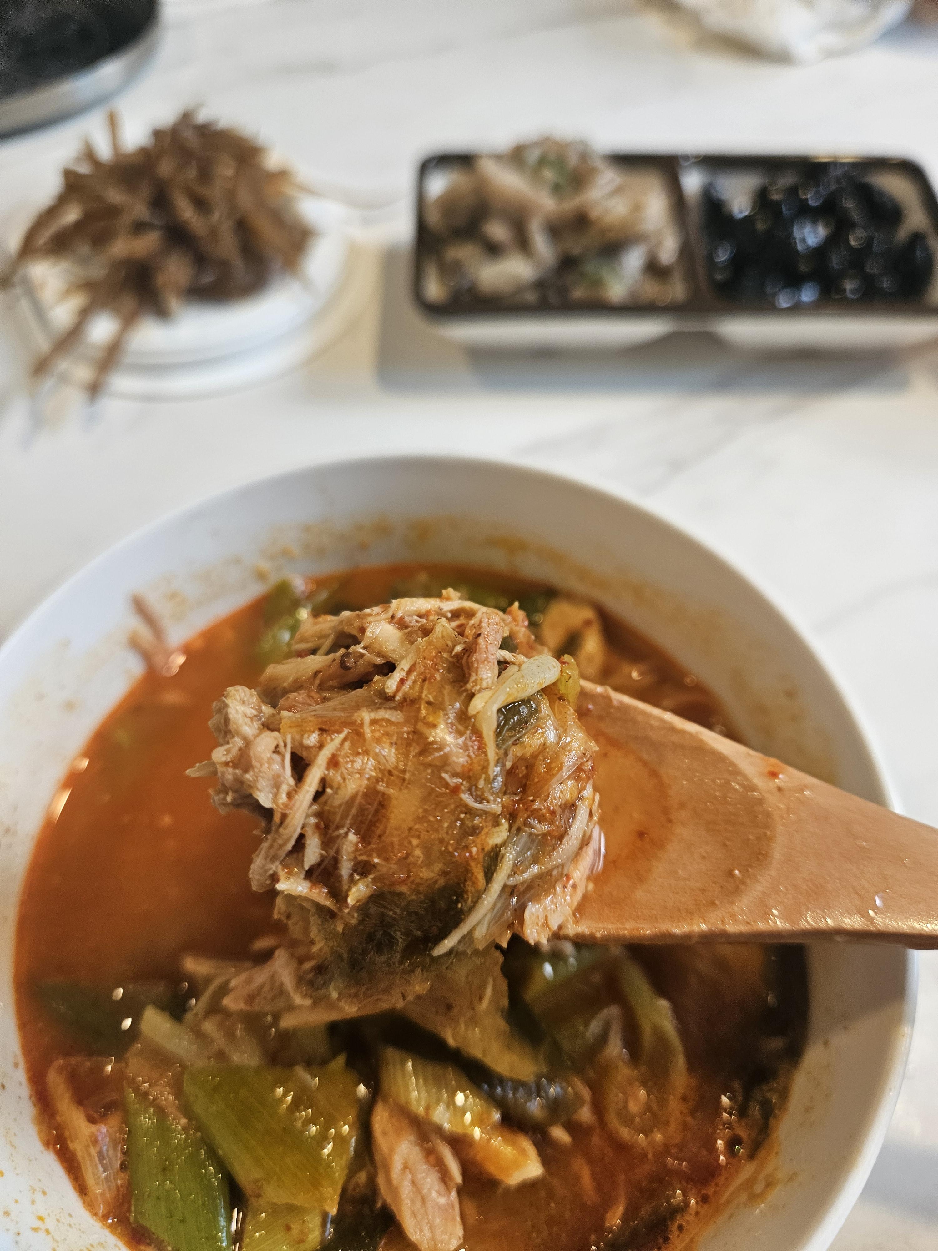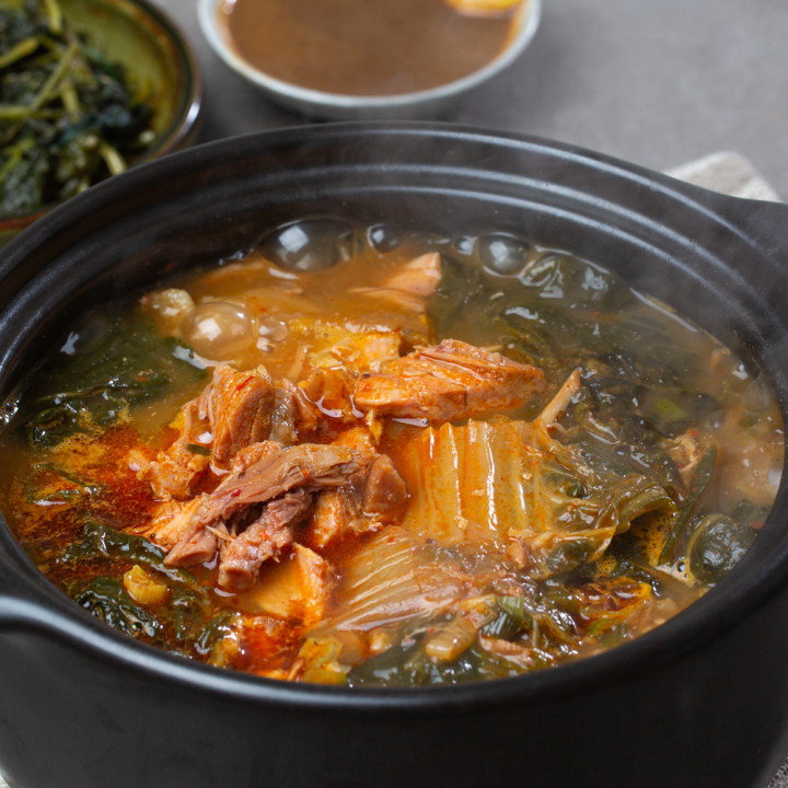 2. 냄비에 해동한 감자탕을 넣고 3분 이상 충분히 끓여주세요. *기호에 따라 깻잎, 대파, 들깨가루 등을 추가해 보세요.