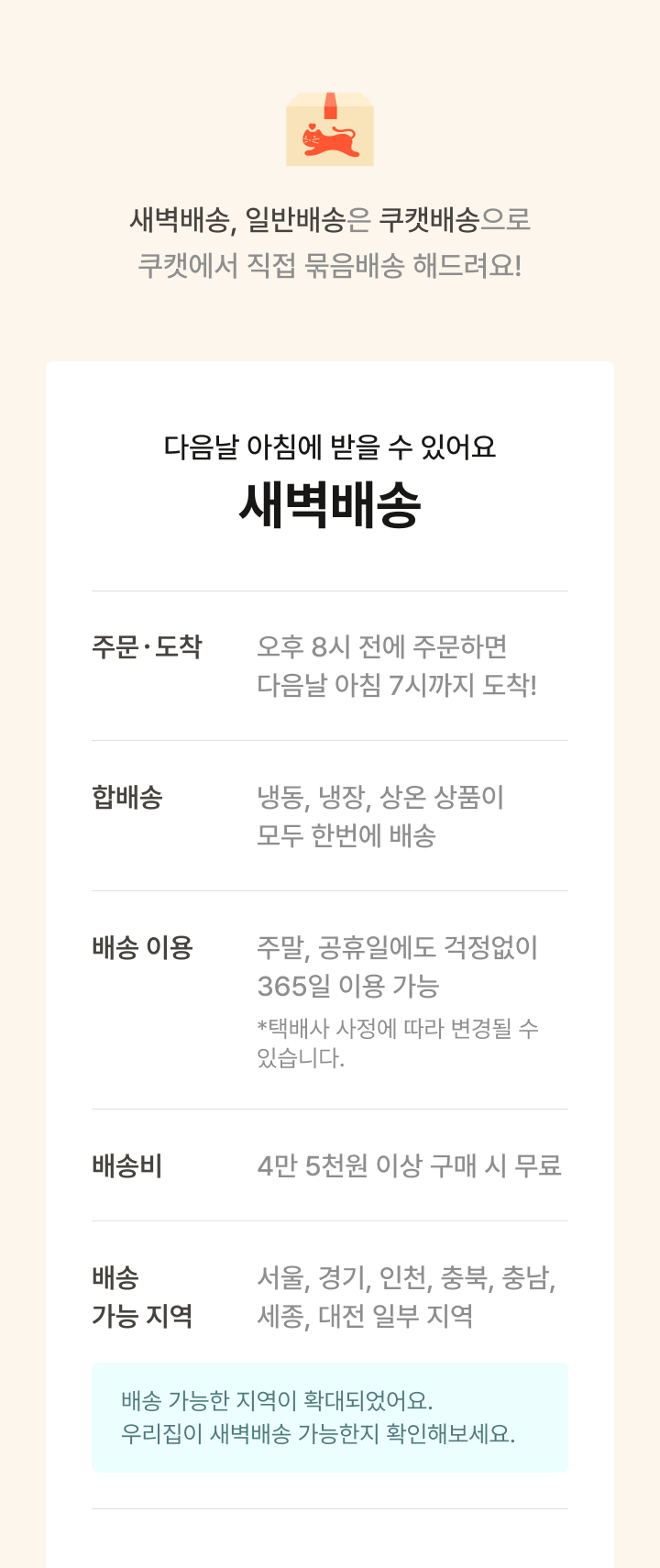 - 새벽배송 가능 지역이더라도 관공서, 군사지역, 학교, 병원, 시장, 백화점, 산업단지 등의 경우 새벽배송이 불가해요.
